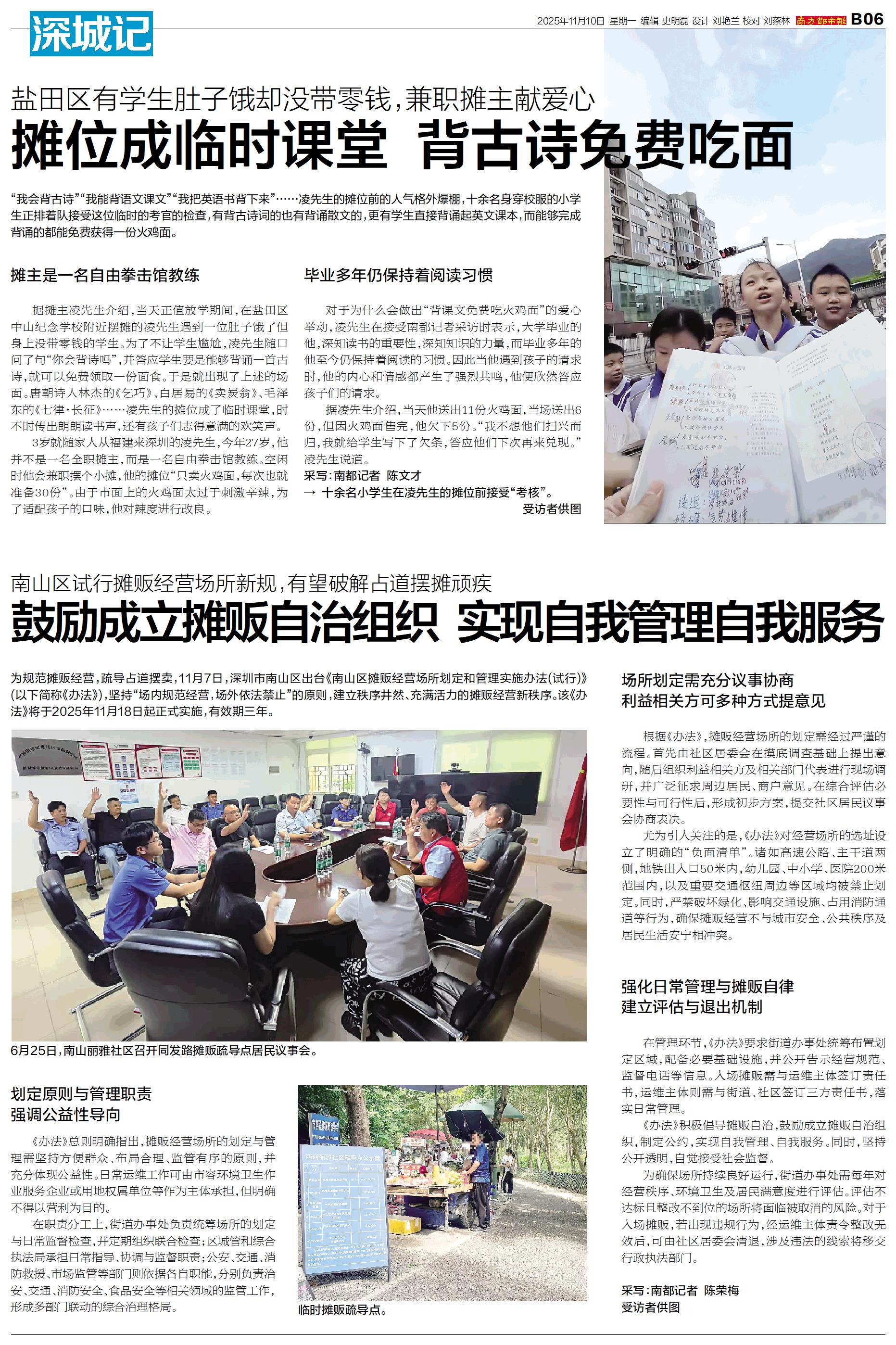 为规范摊贩经营,疏导占道摆卖,11月7日,深圳市南山区出台《南山区摊贩经营场所划定和管理实施办法(试行)》(以下简称《办法》),坚持“场内规范经营,场外依法禁止”的原则,建立秩序井然、充满活力的摊