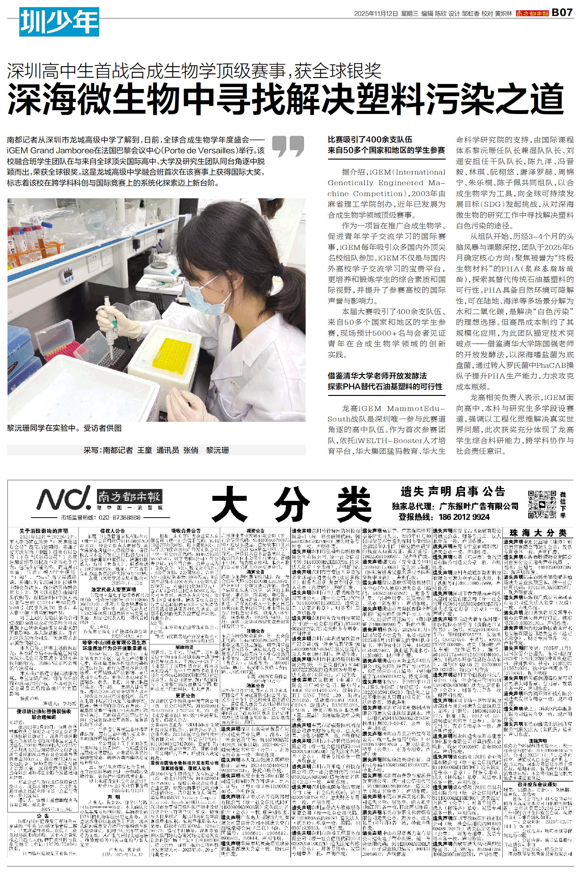 南都记者从深圳市龙城高级中学了解到,日前,全球合成生物学年度盛会——iGEM Grand Jamboree在法国巴黎会议中心(Porte de Versailles)举行。该校融合班学生团队在与来