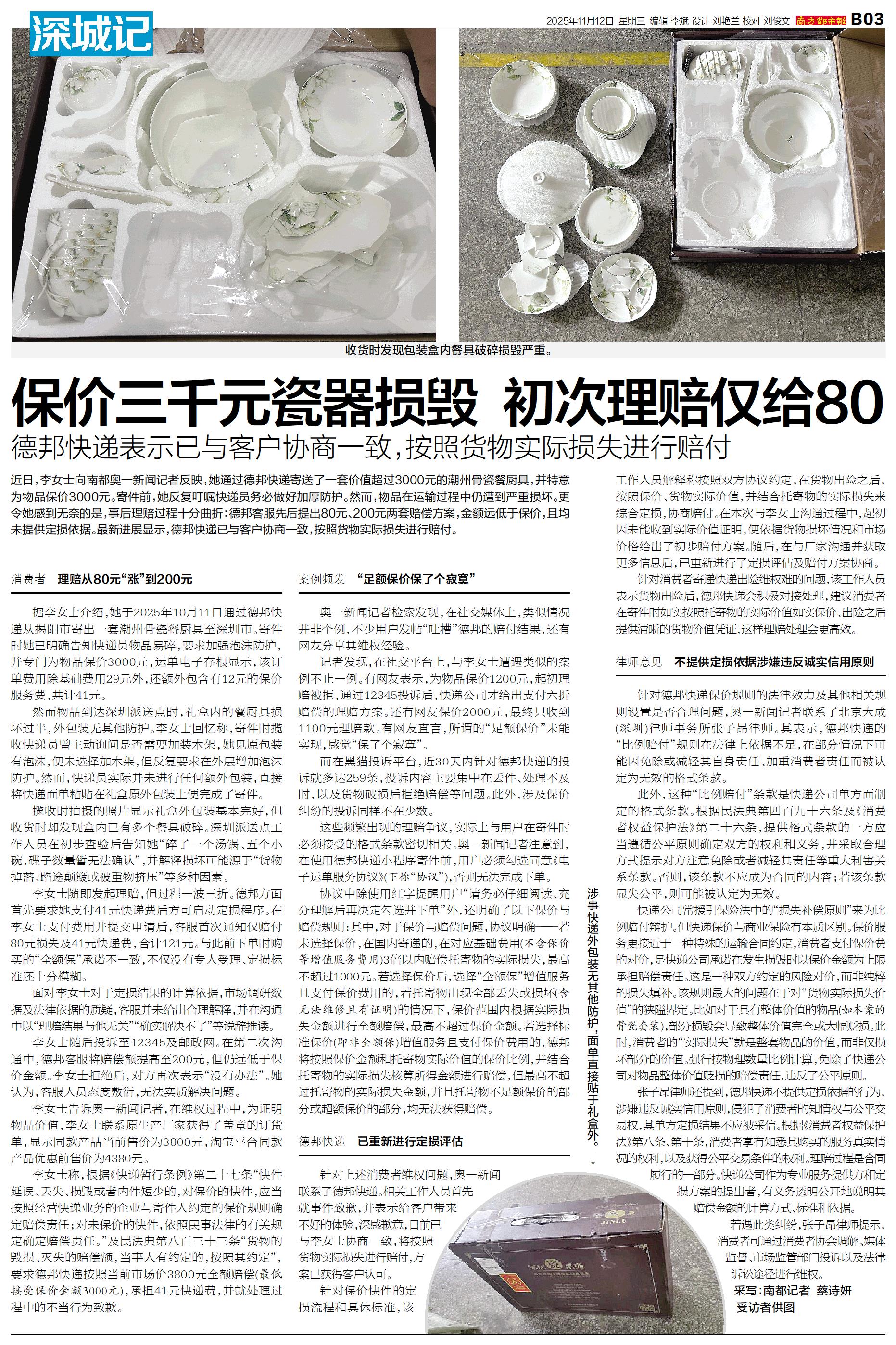 近日,李女士向南都奥一新闻记者反映,她通过德邦快递寄送了一套价值超过3000元的潮州骨瓷餐厨具,并特意为物品保价3000元。寄件前,她反复叮嘱快递员务必做好加厚防护。然而,物品在运输过程中仍遭到严