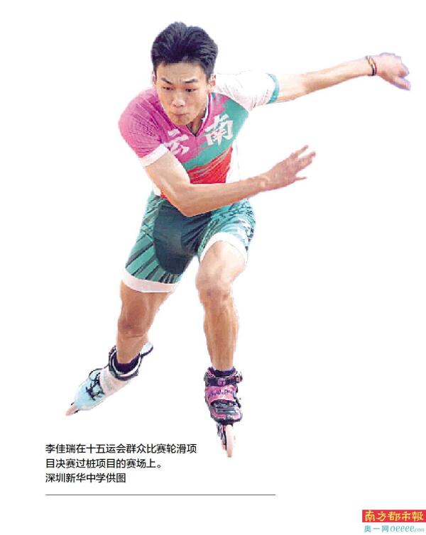日前,在十五运会群众比赛轮滑项目决赛过桩项目的赛场上,当电子计时器定格在3.793秒时,李佳瑞攥紧了手中的轮滑鞋——这个成绩不仅打破他自己保持的世界纪录,更让这位从深圳新华中学走出的少年,再度站上全国最高领奖台。