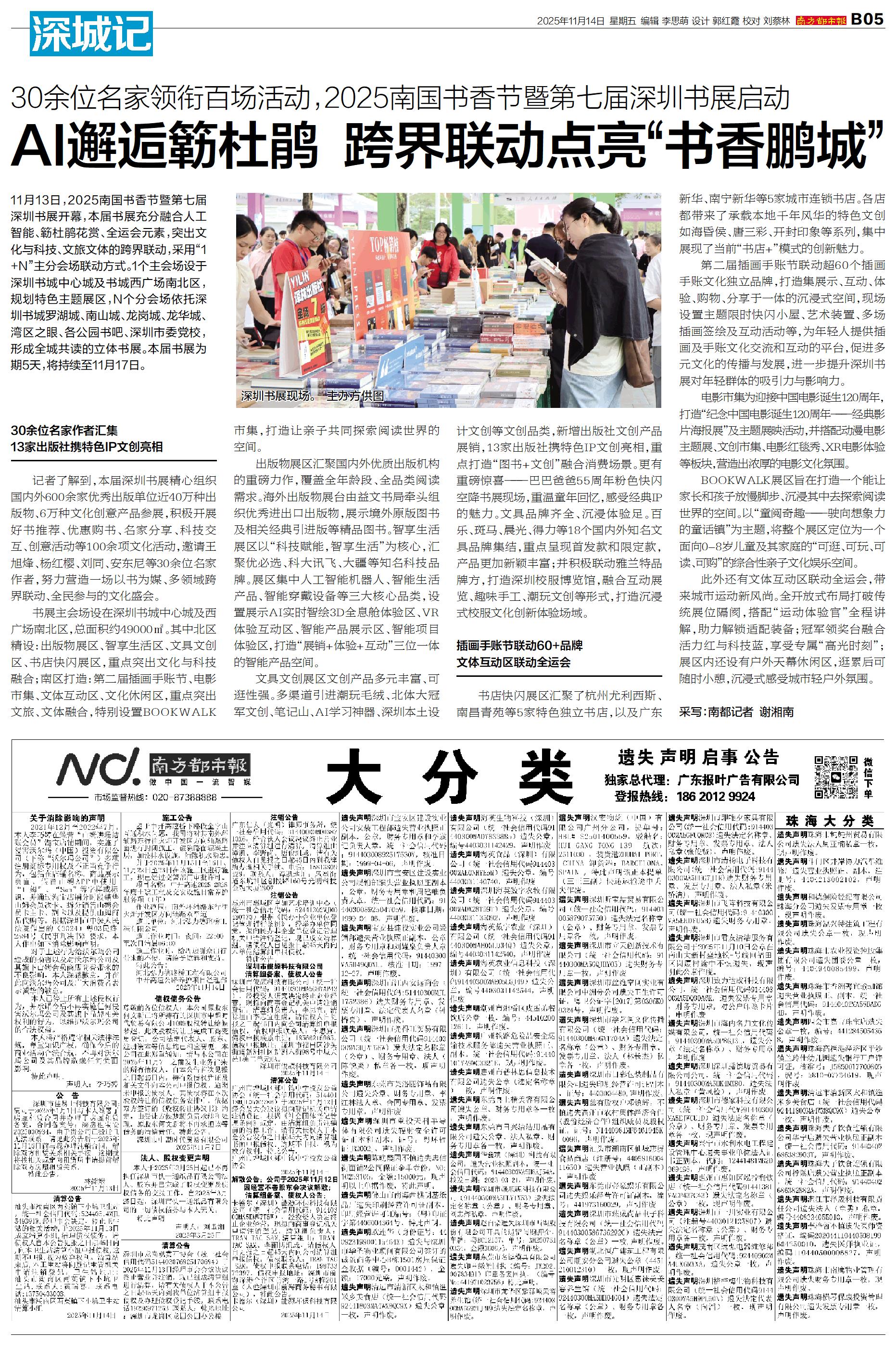 11月13日,2025南国书香节暨第七届深圳书展开幕,本届书展充分融合人工智能、簕杜鹃花赏、全运会元素,突出文化与科技、文旅文体的跨界联动,采用“1+N”主分会场联动方式。1个主会场设于深圳书城中