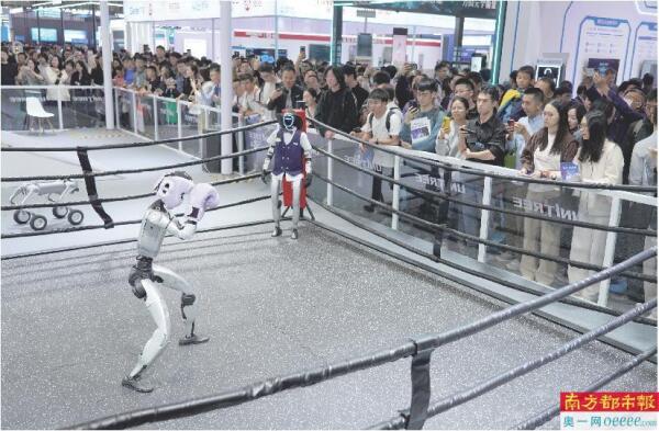 12号馆,宇树科技机器人格斗赛吸引了大量观众围观。