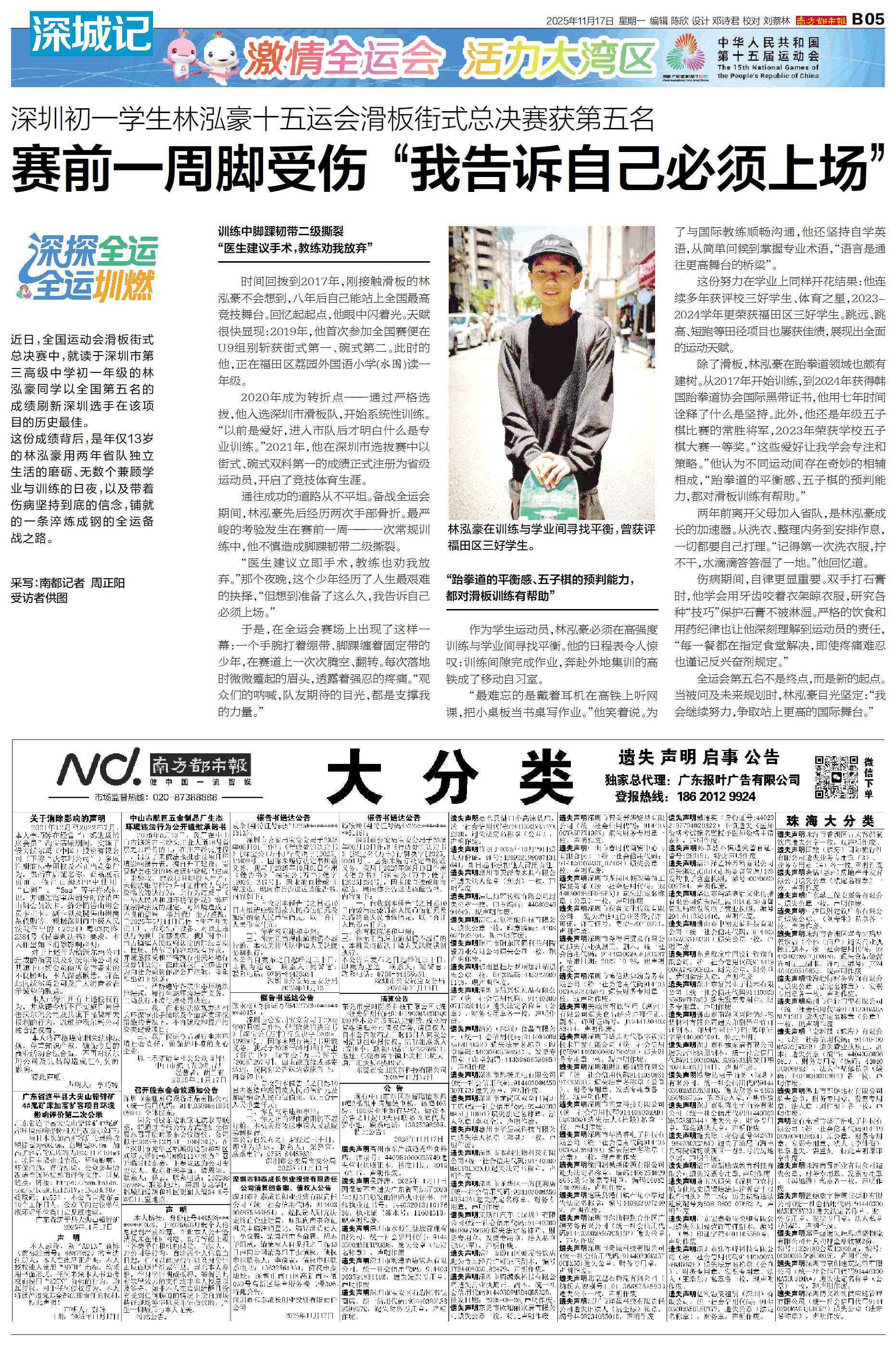 近日,全国运动会滑板街式总决赛中,就读于深圳市第三高级中学初一年级的林泓豪同学以全国第五名的成绩刷新深圳选手在该项目的历史最佳。 这份成绩背后,是年仅13岁的林泓豪用两年省队独立生活的磨砺、无数