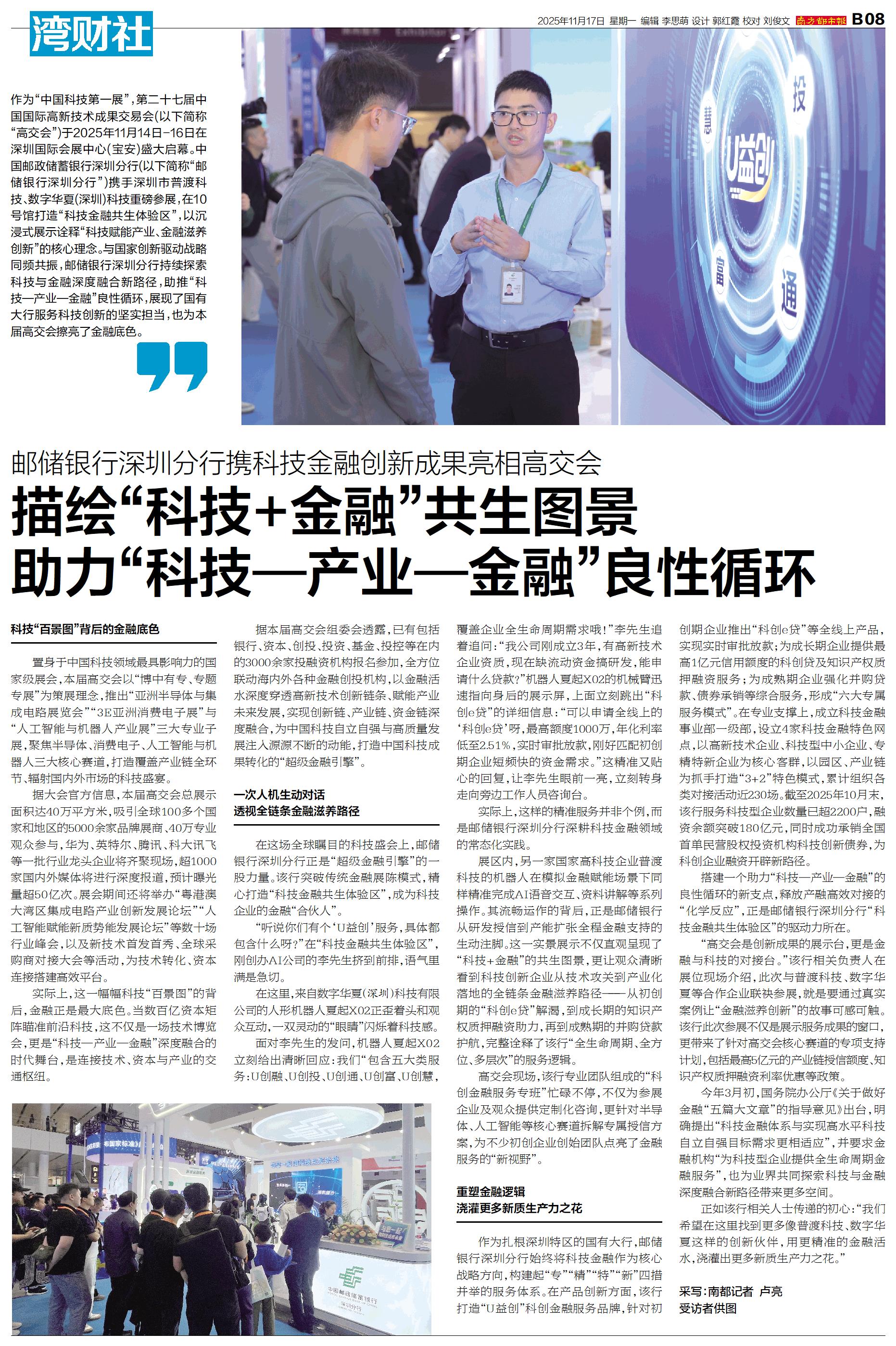 作为“中国科技第一展”,第二十七届中国国际高新技术成果交易会(以下简称“高交会”)于2025年11月14日-16日在深圳国际会展中心(宝安)盛大启幕。中国邮政储蓄银行深圳分行(以下简称“邮储银行深