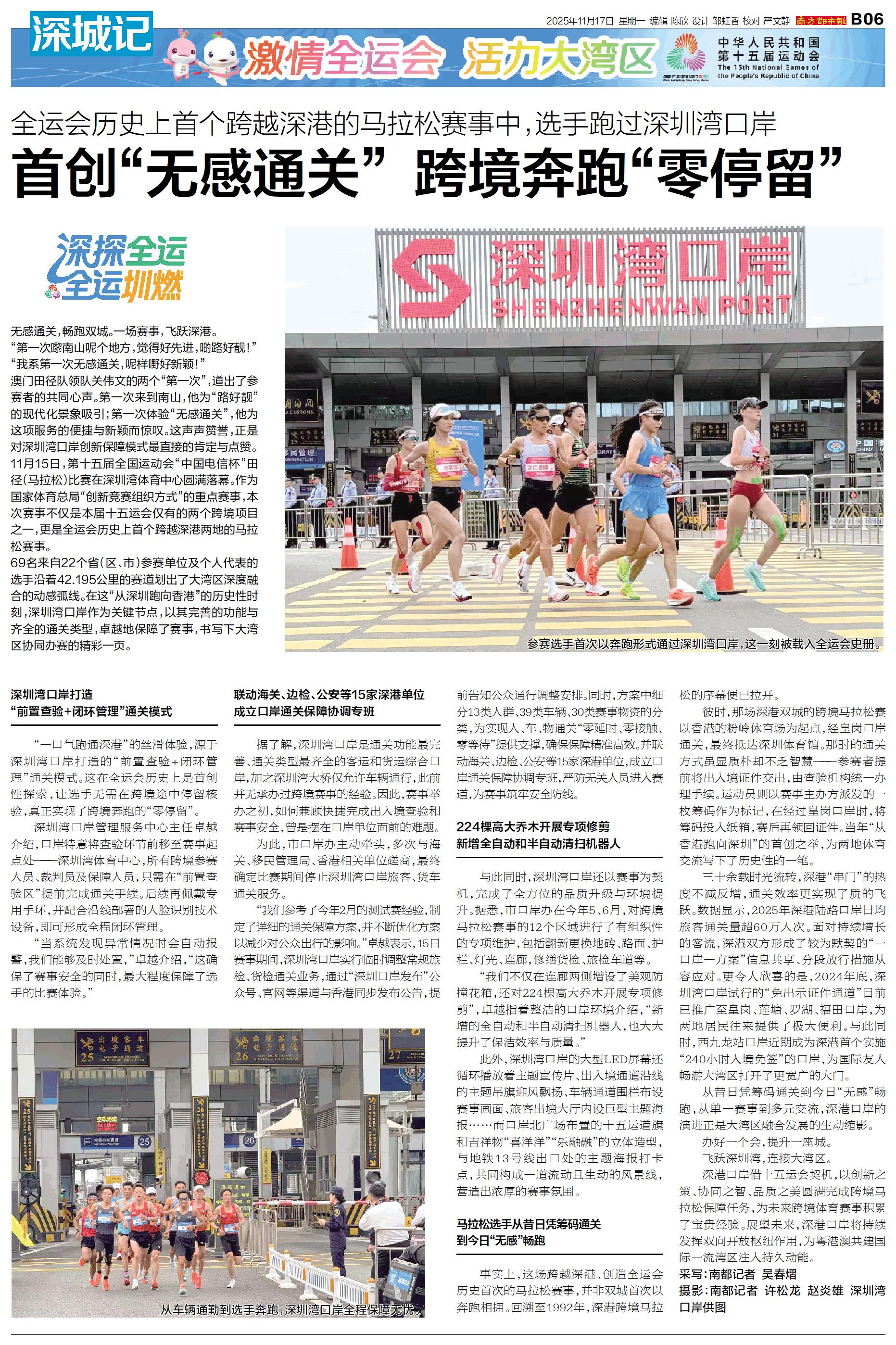 无感通关,畅跑双城。一场赛事,飞跃深港。 “第一次嚟南山呢个地方,觉得好先进,啲路好靓!” “我系第一次无感通关,呢样嘢好新颖!” 澳门田径队领队关伟文的两个“第一次”,道出了参赛者的共同心