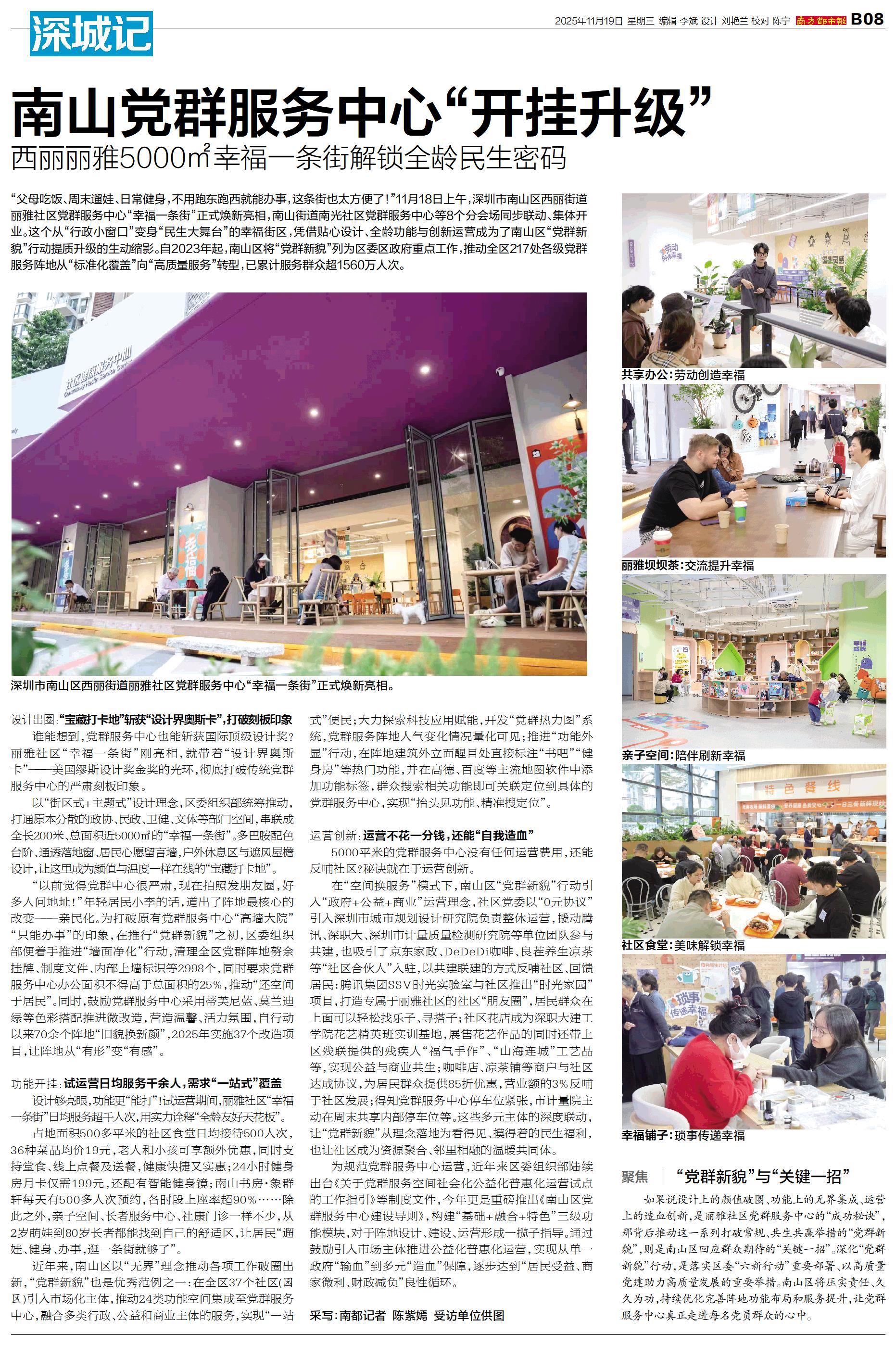 “父母吃饭、周末遛娃、日常健身,不用跑东跑西就能办事,这条街也太方便了!”11月18日上午,深圳市南山区西丽街道丽雅社区党群服务中心“幸福一条街”正式焕新亮相,南山街道南光社区党群服务中心等8个分