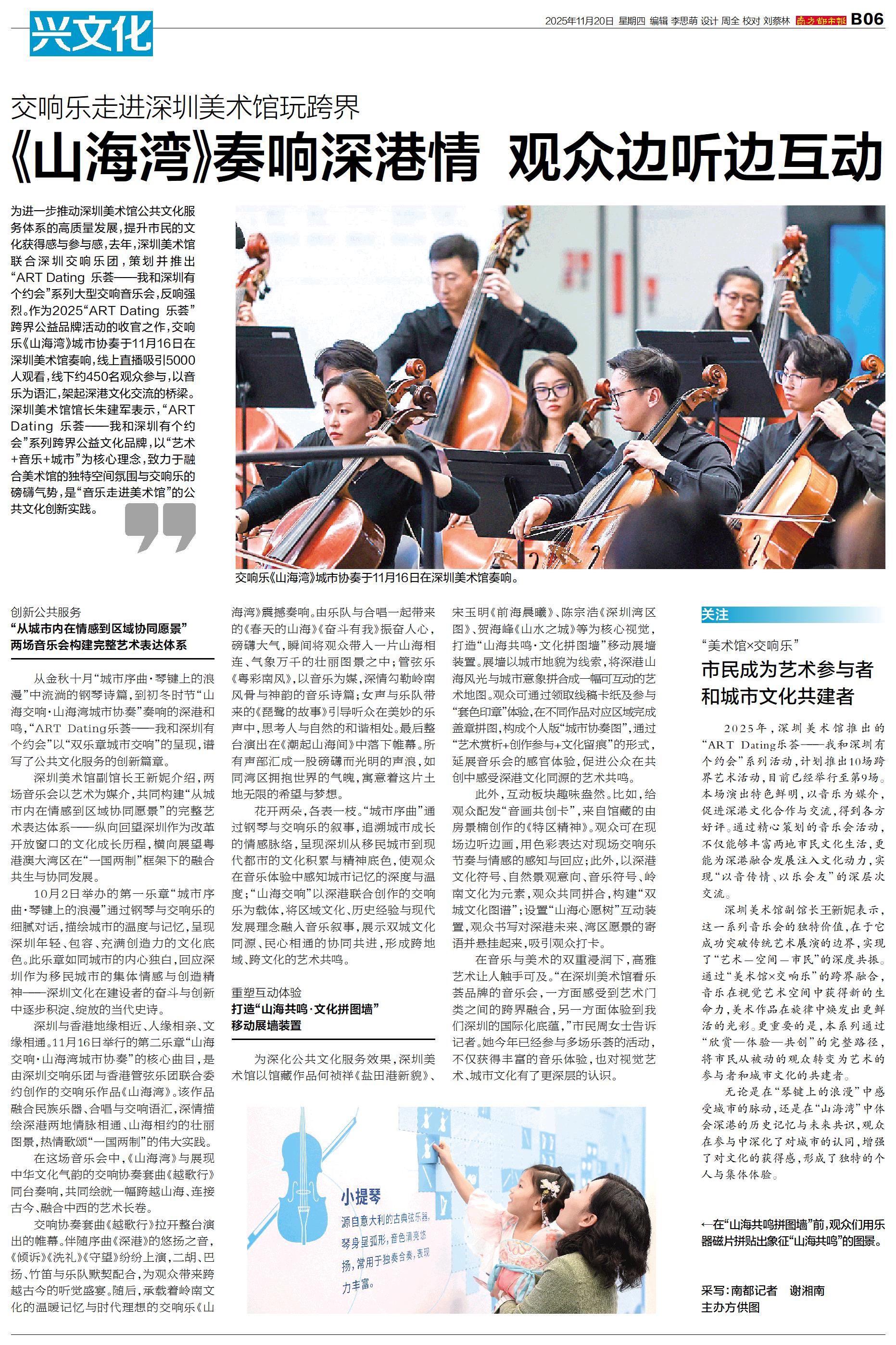 为进一步推动深圳美术馆公共文化服务体系的高质量发展,提升市民的文化获得感与参与感,去年,深圳美术馆联合深圳交响乐团,策划并推出“ART Dating 乐荟——我和深圳有个约会”系列大型交响音乐会,