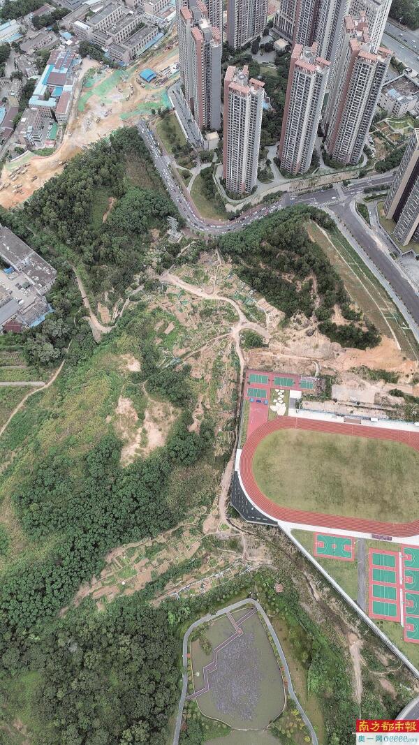1. 航拍图显示坪地熙珑山小区距离公园直线距离非常近,但因绿道被毁,居民出入公园极为艰难。