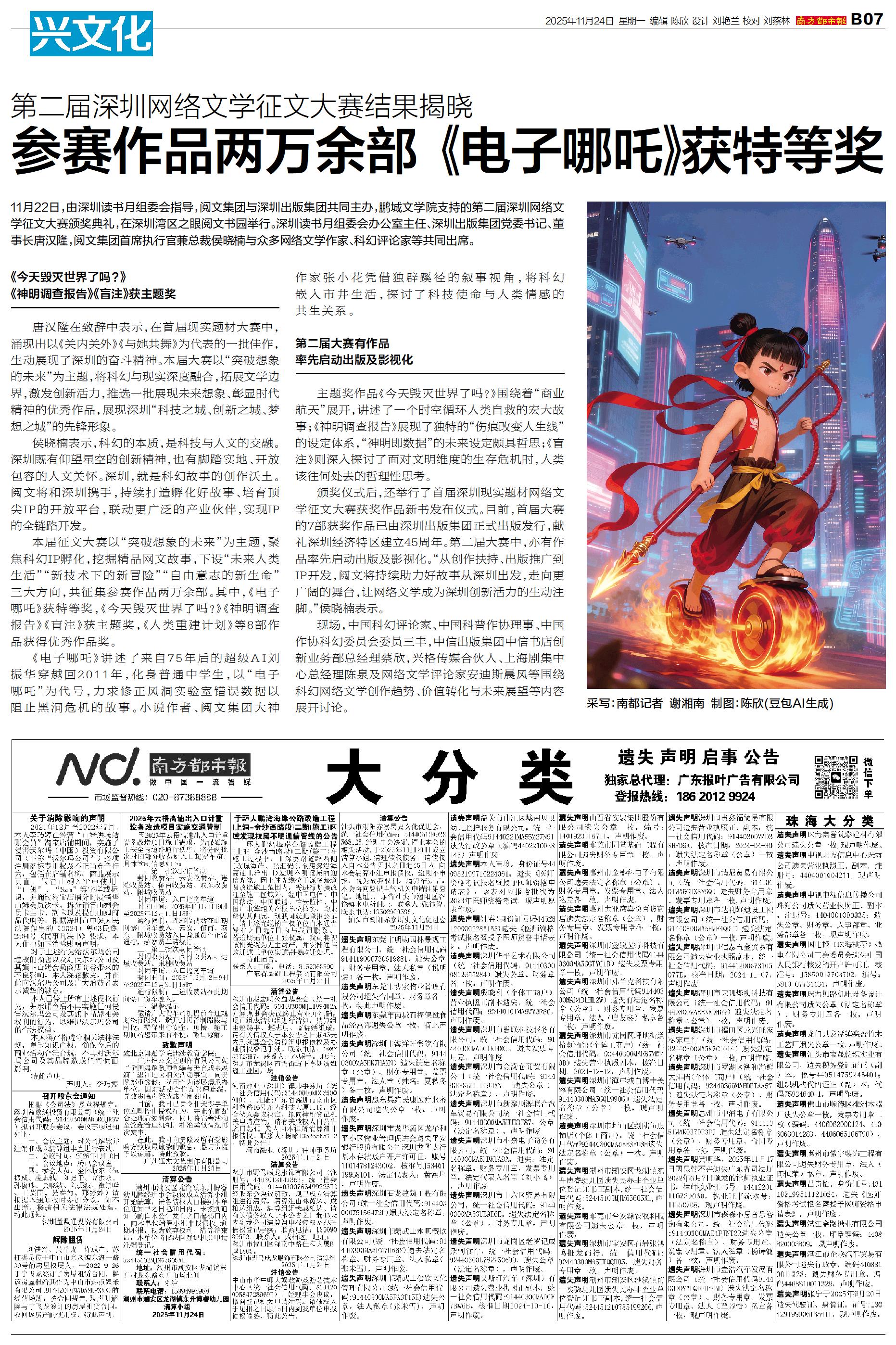 11月22日,由深圳读书月组委会指导,阅文集团与深圳出版集团共同主办,鹏城文学院支持的第二届深圳网络文学征文大赛颁奖典礼,在深圳湾区之眼阅文书园举行。深圳读书月组委会办公室主任、深圳出版集团党委书