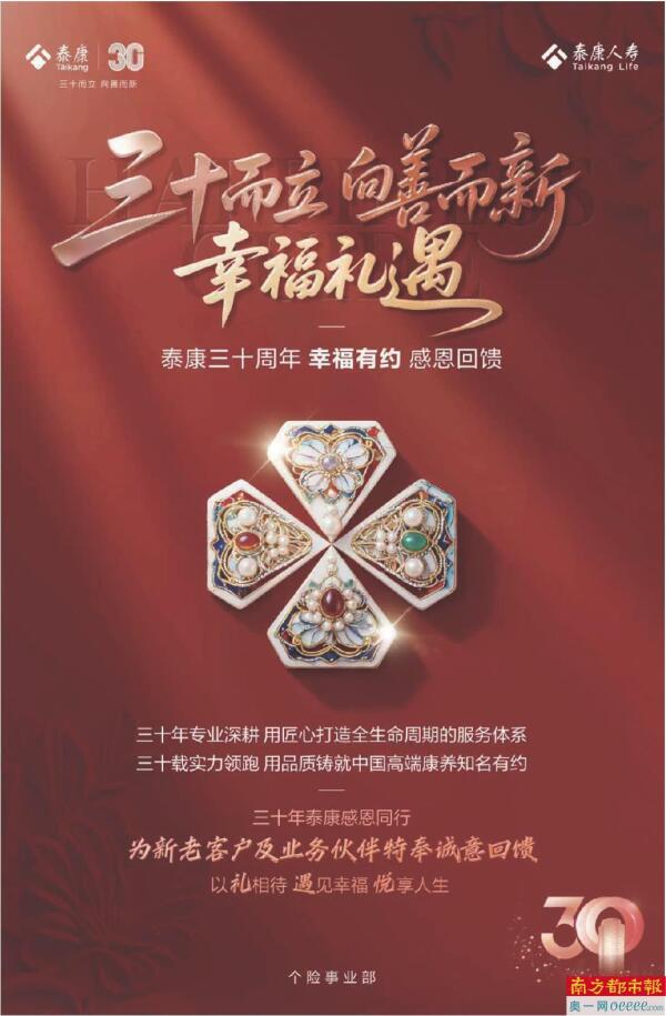 值泰康迎接成立30周年之际,为感恩客户长期信赖,泰康人寿重磅推出幸福有约三十周年系列政策。此次权益升级通过“双分红保险+养老社区”的创新组合,让更广大客户链接优质医养资源与专业财富管理服务,为客户打造覆盖全生命周期的养医解决方案。
