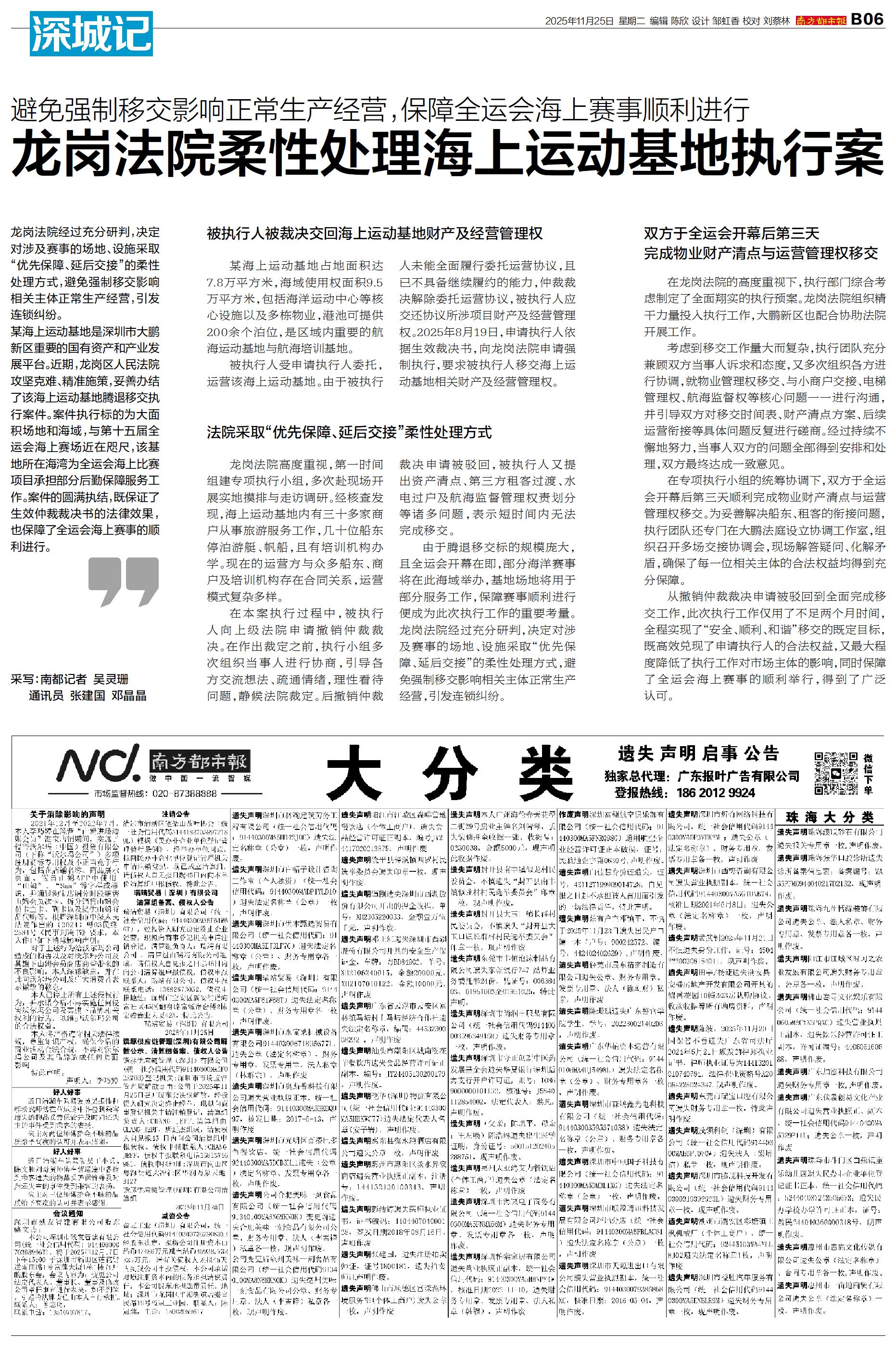 龙岗法院经过充分研判,决定对涉及赛事的场地、设施采取“优先保障、延后交接”的柔性处理方式,避免强制移交影响相关主体正常生产经营,引发连锁纠纷。 某海上运动基地是深圳市大鹏新区重要的国有资产和产业