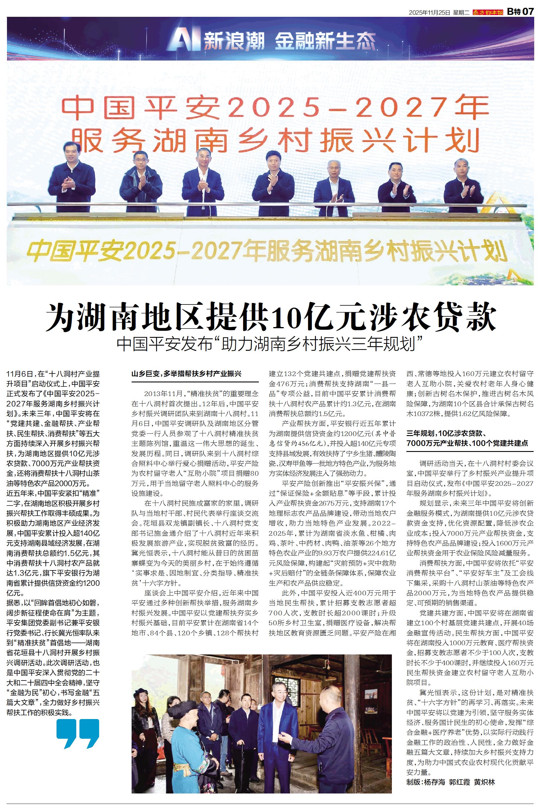 11月6日,在“十八洞村产业提升项目”启动仪式上,中国平安正式发布了《中国平安2025-2027年服务湖南乡村振兴计划》。未来三年,中国平安将在“党建共建、金融帮扶、产业帮扶、民生帮扶、消费帮扶”