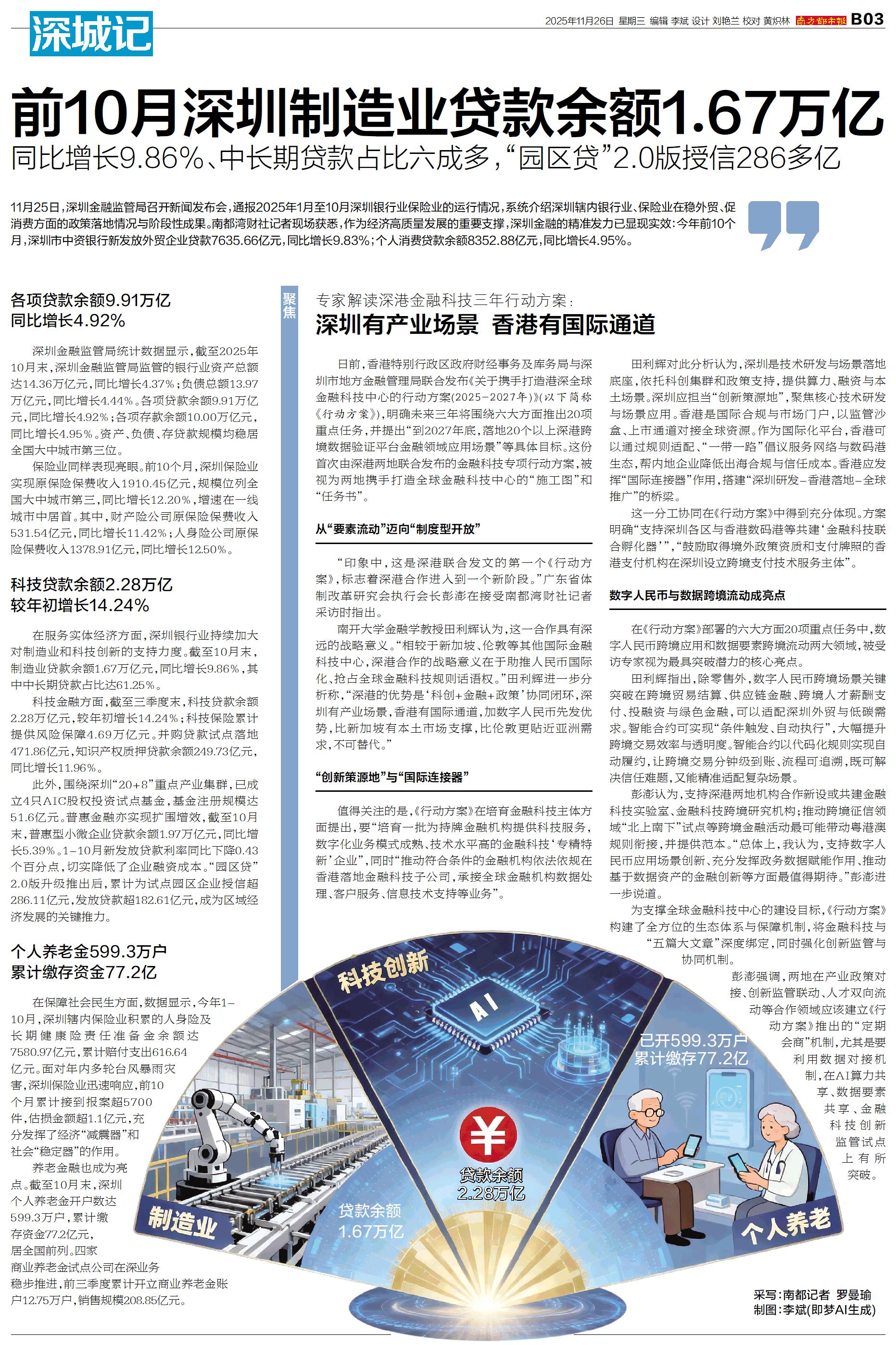 11月25日,深圳金融监管局召开新闻发布会,通报2025年1月至10月深圳银行业保险业的运行情况,系统介绍深圳辖内银行业、保险业在稳外贸、促消费方面的政策落地情况与阶段性成果。南都湾财社记者现场获