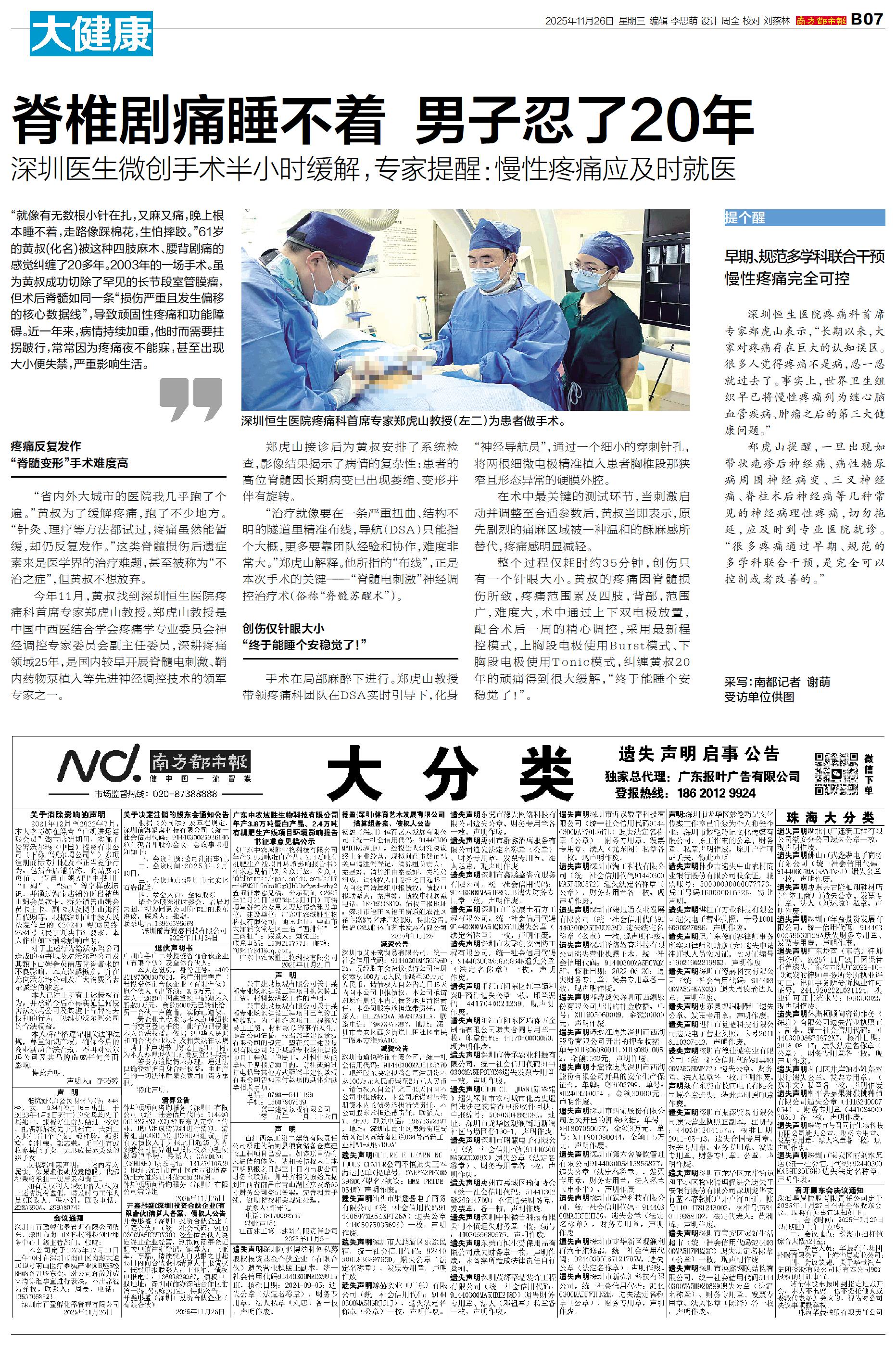 “就像有无数根小针在扎,又麻又痛,晚上根本睡不着,走路像踩棉花,生怕摔跤。”61岁的黄叔(化名)被这种四肢麻木、腰背剧痛的感觉纠缠了20多年。2003年的一场手术。虽为黄叔成功切除了罕见的长节段室