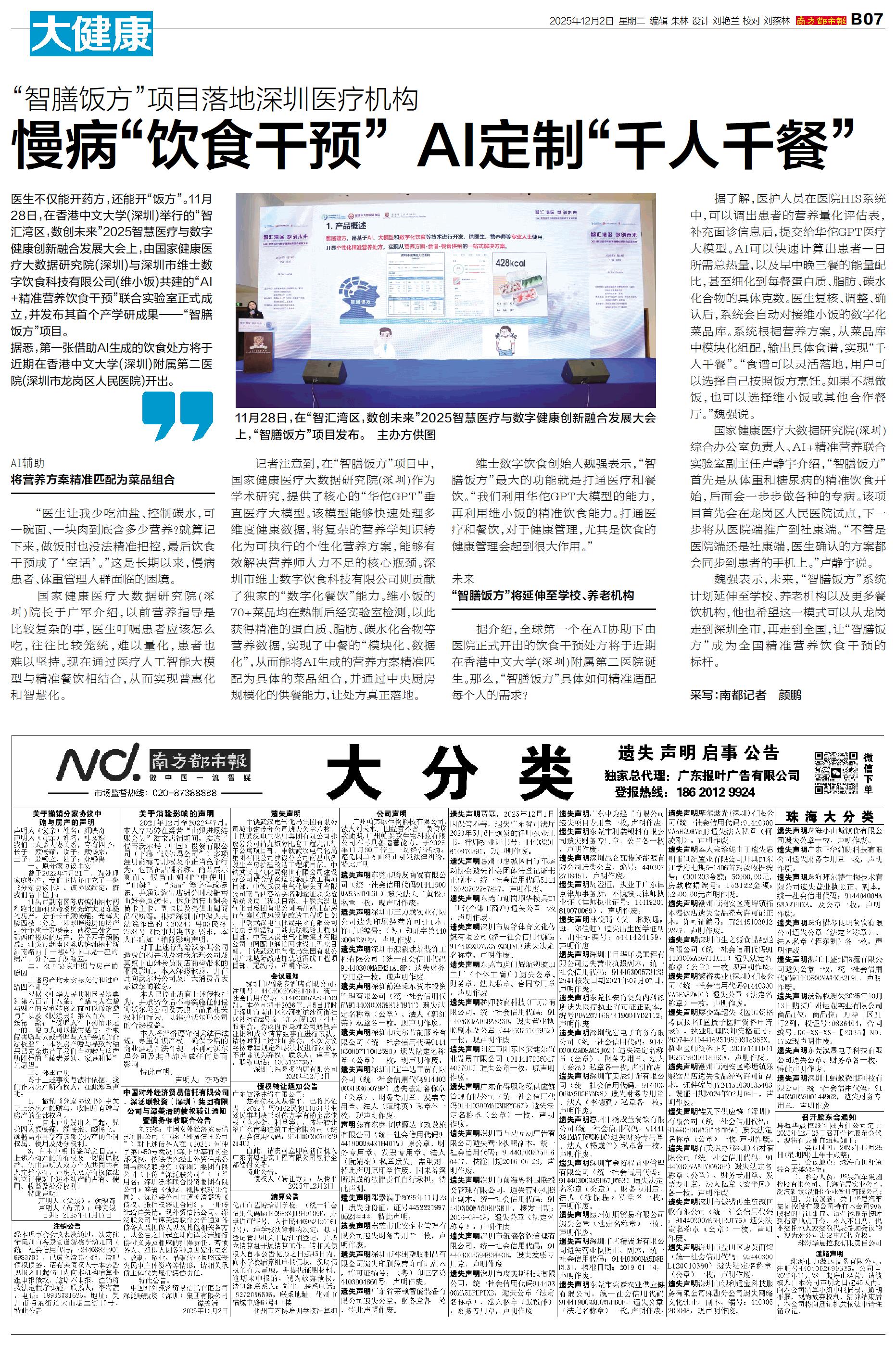 医生不仅能开药方,还能开“饭方”。11月28日,在香港中文大学(深圳)举行的“智汇湾区,数创未来”2025智慧医疗与数字健康创新融合发展大会上,由国家健康医疗大数据研究院(深圳)与深圳市维士数字饮