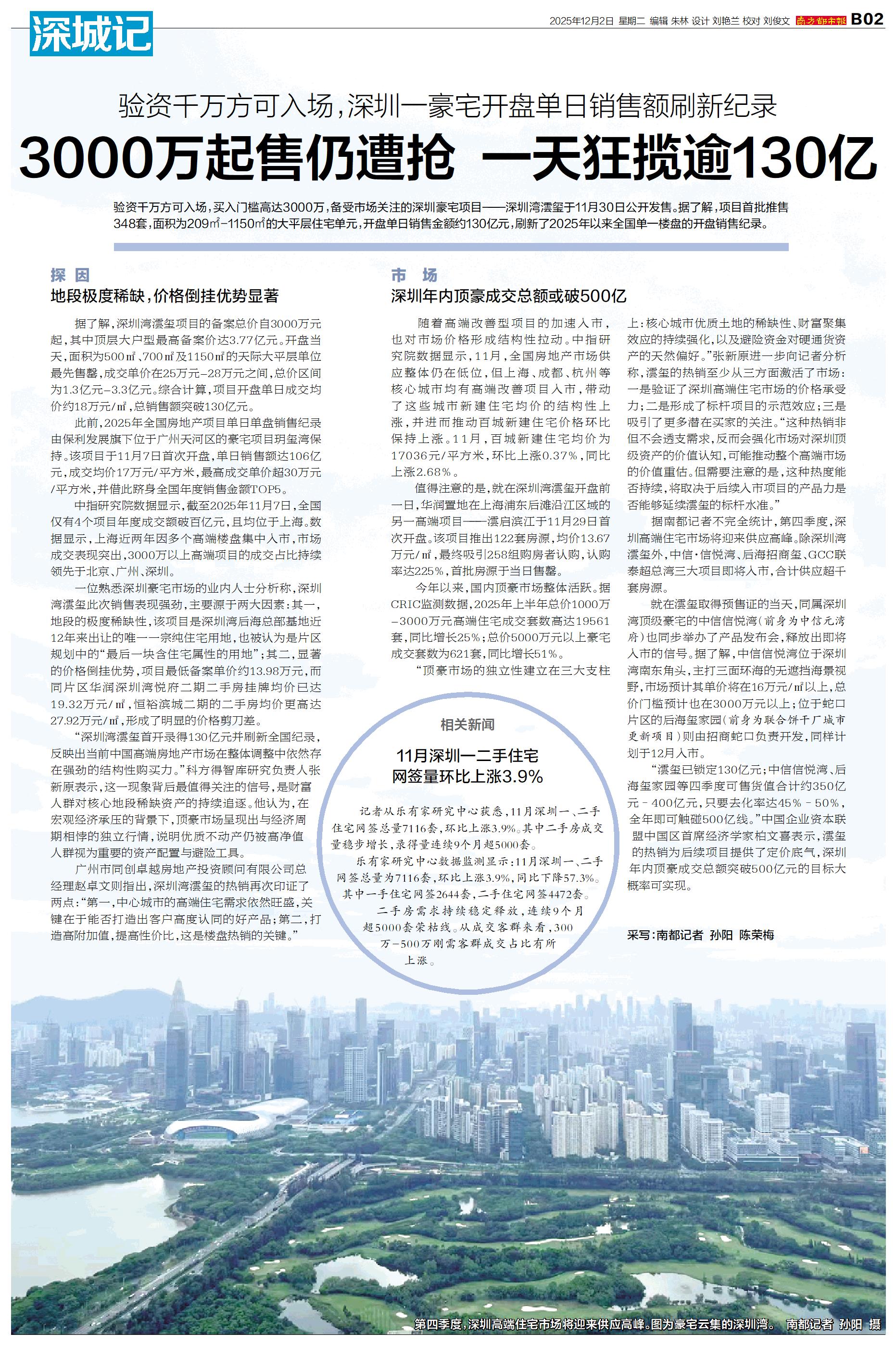 验资千万方可入场,买入门槛高达3000万,备受市场关注的深圳豪宅项目——深圳湾澐玺于11月30日公开发售。据了解,项目首批推售348套,面积为209㎡-1150㎡的大平层住宅单元,开盘单日销售金额