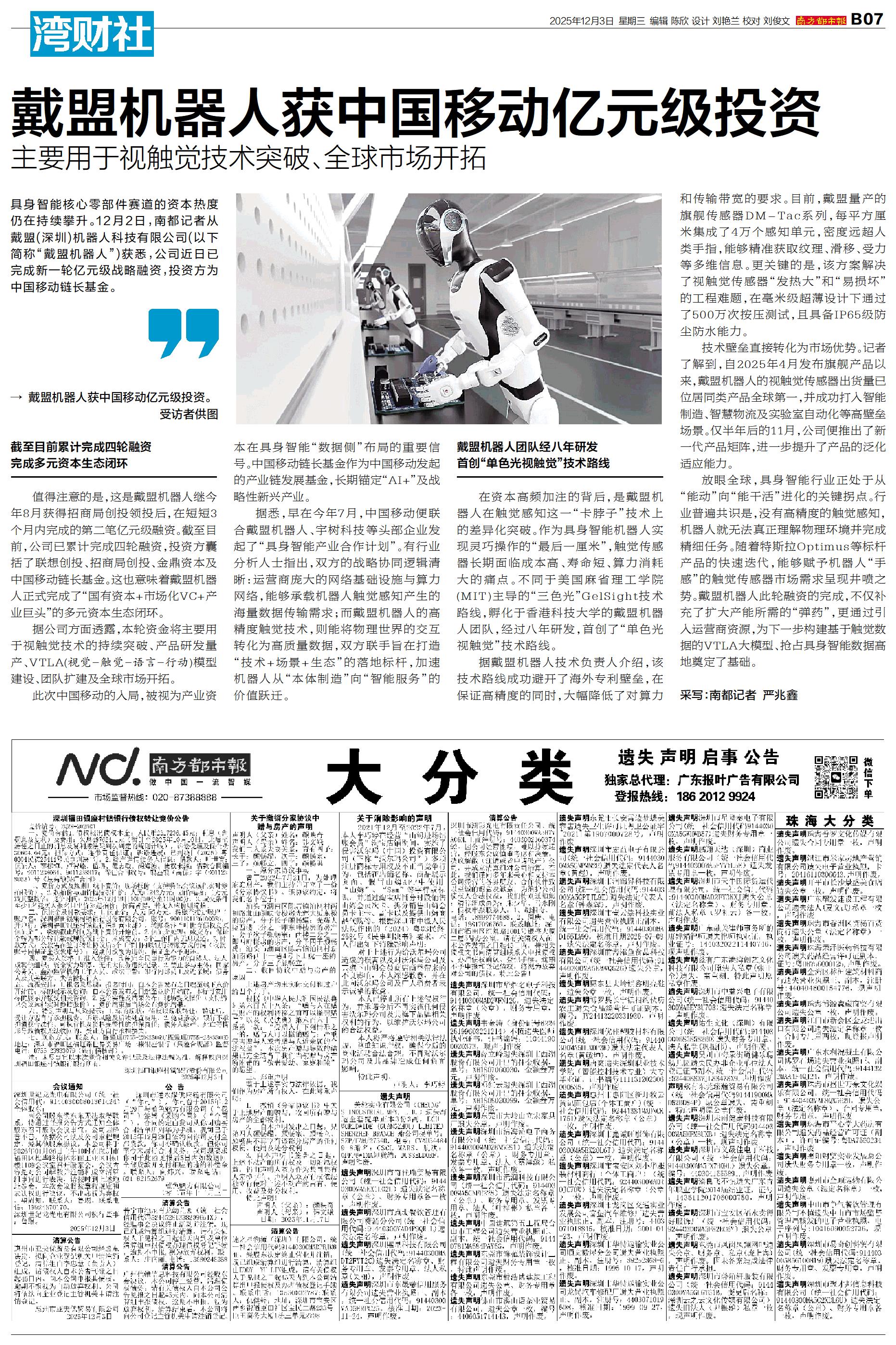 具身智能核心零部件赛道的资本热度仍在持续攀升。12月2日,南都记者从戴盟(深圳)机器人科技有限公司(以下简称“戴盟机器人”)获悉,公司近日已完成新一轮亿元级战略融资,投资方为中国移动链长基金。