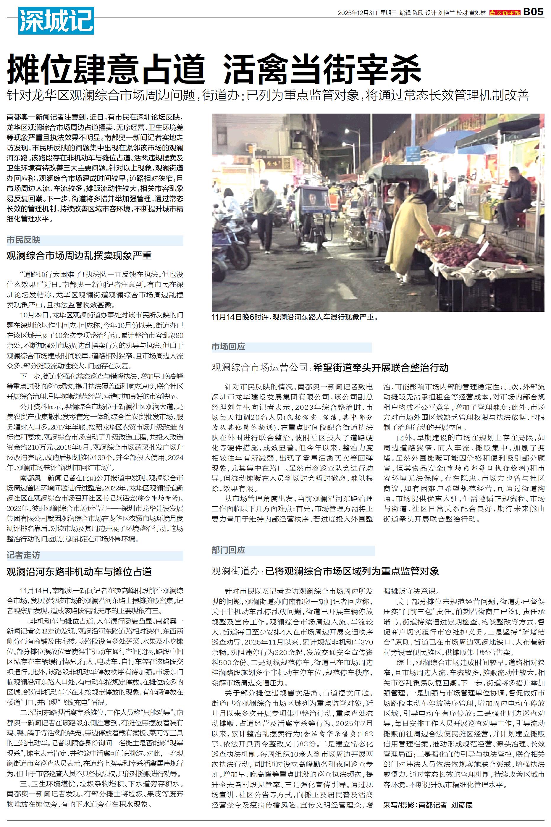 南都奥一新闻记者注意到,近日,有市民在深圳论坛反映,龙华区观澜综合市场周边占道摆卖、无序经营、卫生环境差等现象严重且执法效果不明显。南都奥一新闻记者实地走访发现,市民所反映的问题集中出现在紧邻该市