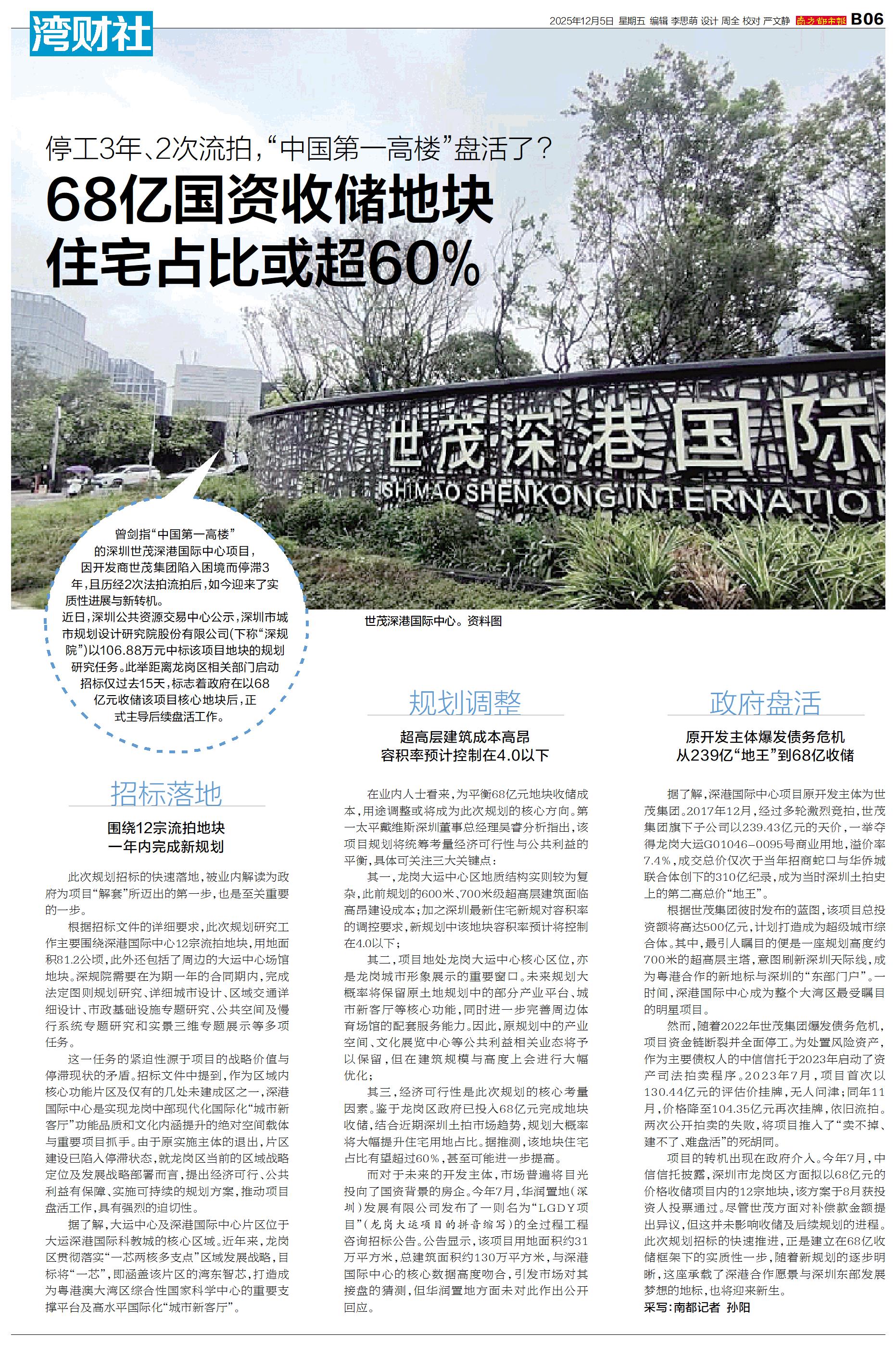 曾剑指“中国第一高楼”的深圳世茂深港国际中心项目,因开发商世茂集团陷入困境而停滞3年,且历经2次法拍流拍后,如今迎来了实质性进展与新转机。 近日,深圳公共资源交易中心公示,深圳市城市规划设计研究