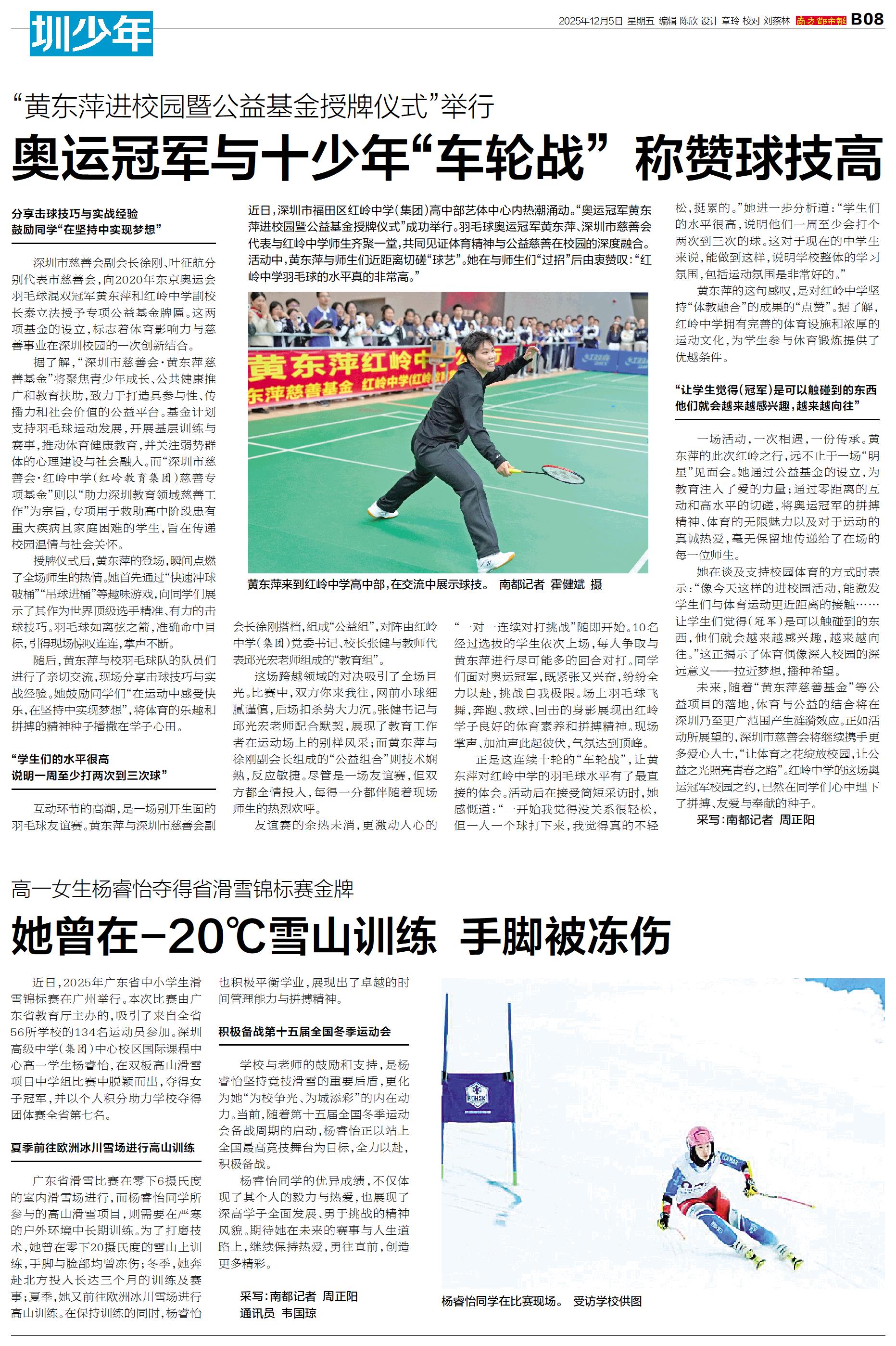 近日,深圳市福田区红岭中学(集团)高中部艺体中心内热潮涌动。“奥运冠军黄东萍进校园暨公益基金授牌仪式”成功举行。羽毛球奥运冠军黄东萍、深圳市慈善会代表与红岭中学师生齐聚一堂,共同见证体育精神与公益