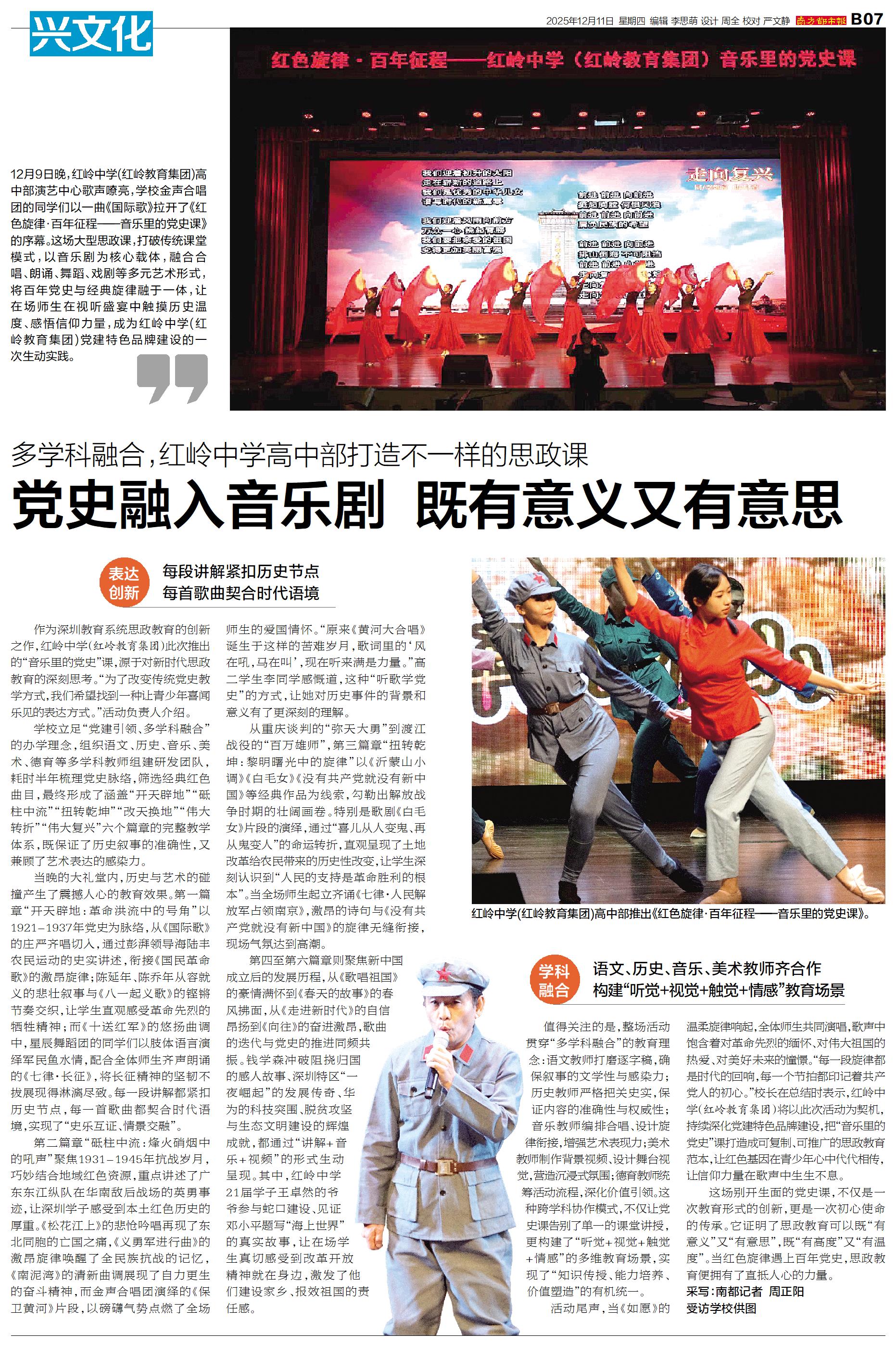 12月9日晚,红岭中学(红岭教育集团)高中部演艺中心歌声嘹亮,学校金声合唱团的同学们以一曲《国际歌》拉开了《红色旋律·百年征程——音乐里的党史课》的序幕。这场大型思政课,打破传统课堂模式,以音乐剧
