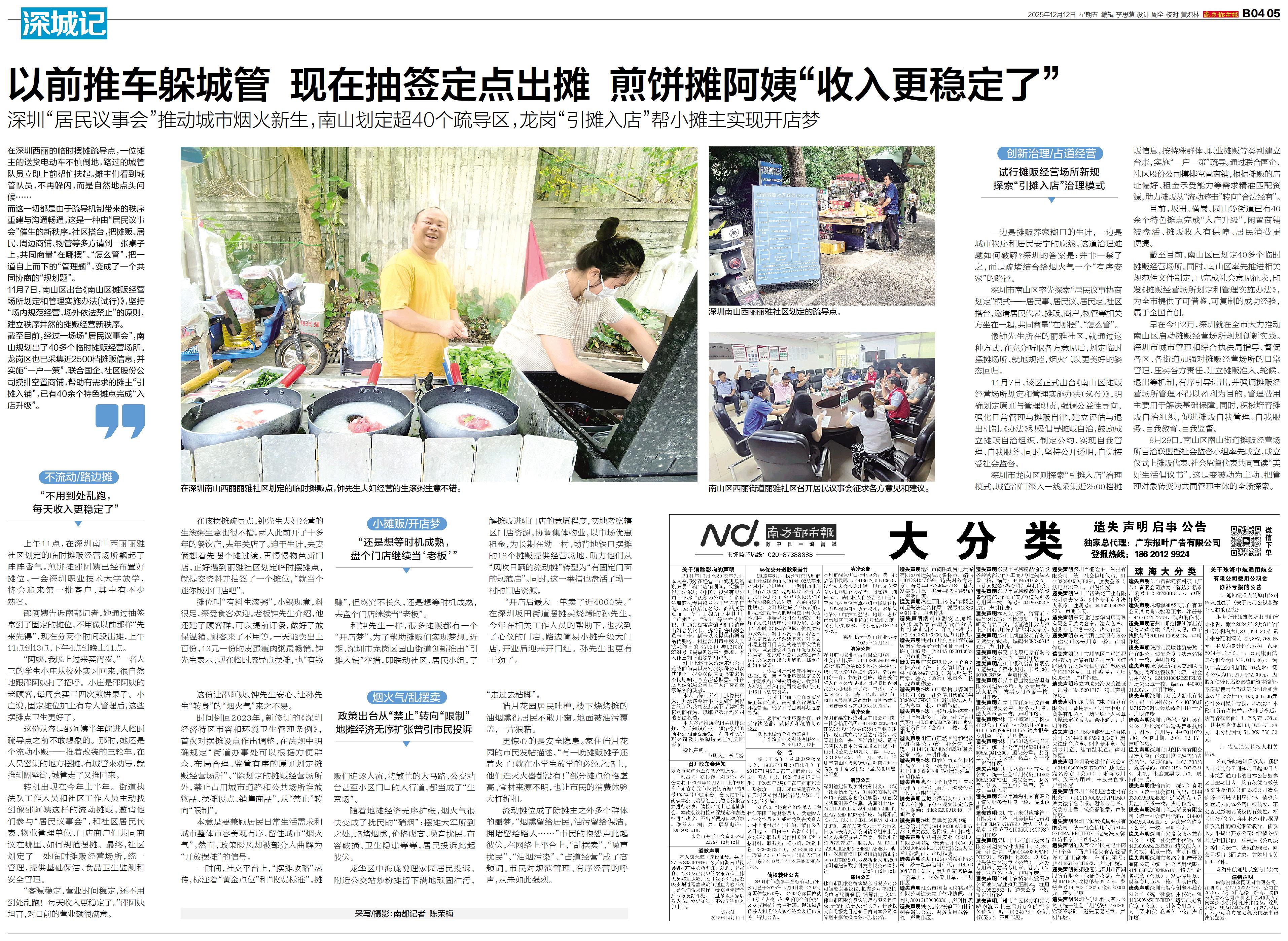 11月7日,南山区出台《南山区摊贩经营场所划定和管理实施办法(试行)》,坚持“场内规范经营,场外依法禁止”的原则,建立秩序井然的摊贩经营新秩序。