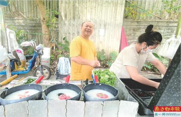 在深圳南山西丽丽雅社区划定的临时摊贩点,钟先生夫妇经营的生滚粥生意不错。