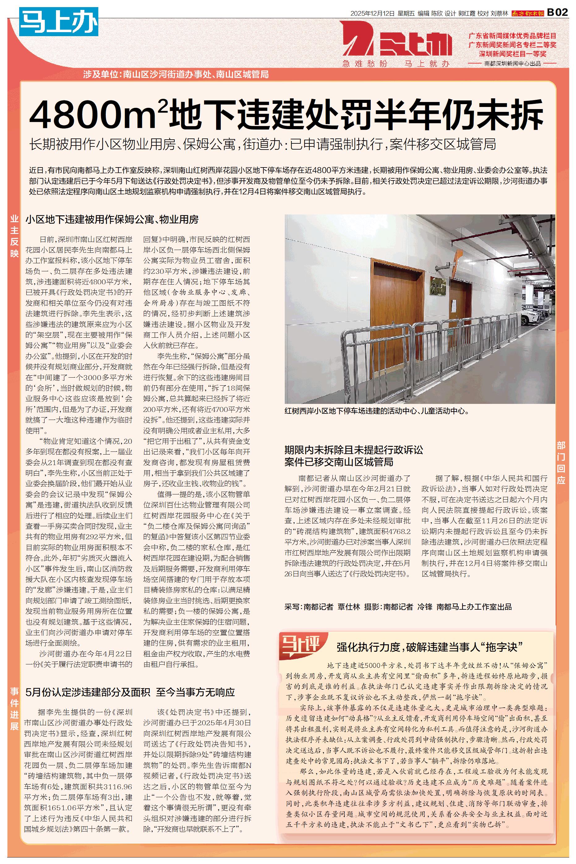 涉及单位:南山区沙河街道办事处、南山区城管局 近日,有市民向南都马上办工作室反映称,深圳南山红树西岸花园小区地下停车场存在近4800平方米违建,长期被用作保姆公寓、物业用房、业委会办公室等。执法