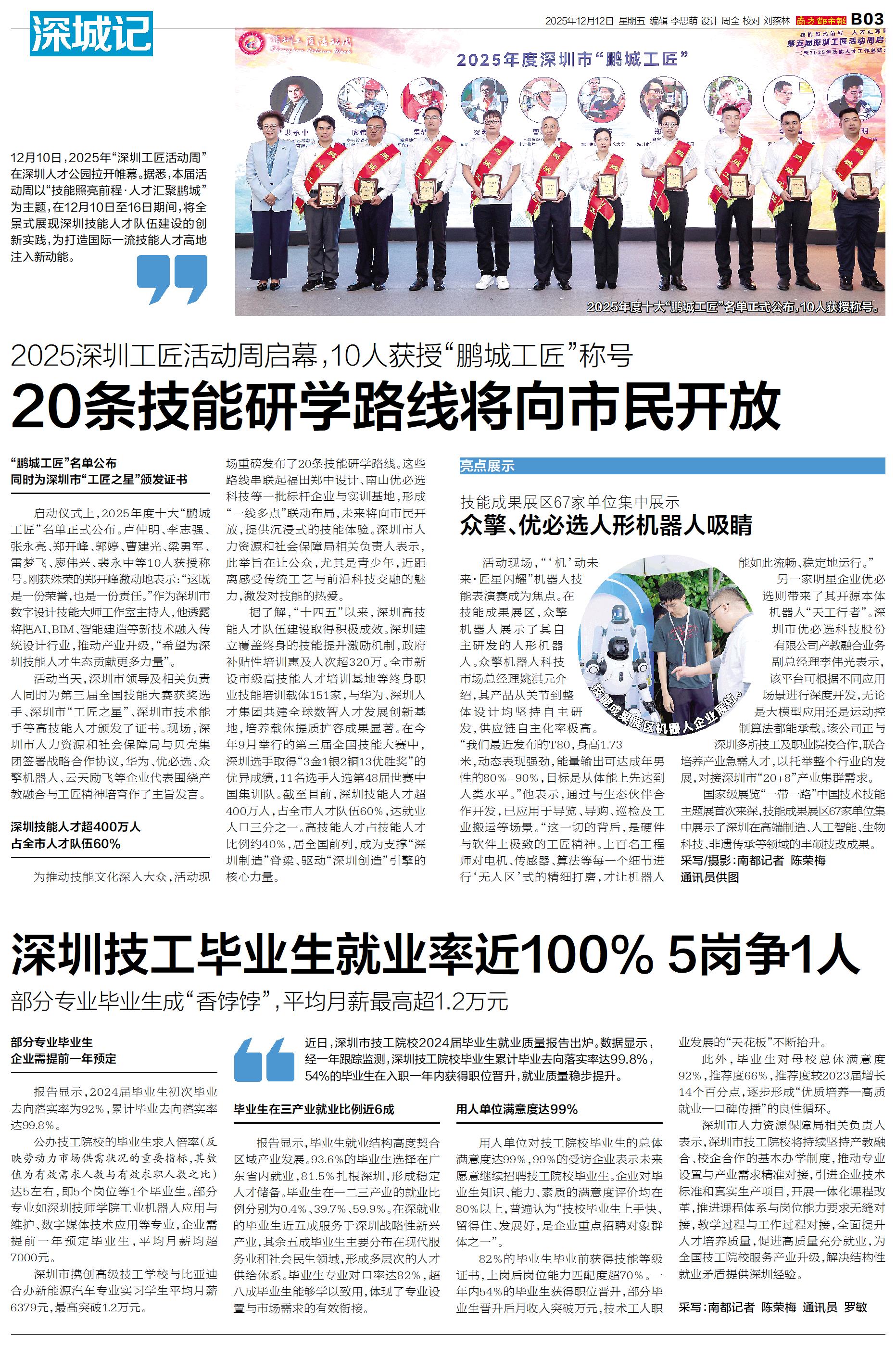 12月10日,2025年“深圳工匠活动周”在深圳人才公园拉开帷幕。据悉,本届活动周以“技能照亮前程·人才汇聚鹏城”为主题,在12月10日至16日期间,将全景式展现深圳技能人才队伍建设的创新实践,为