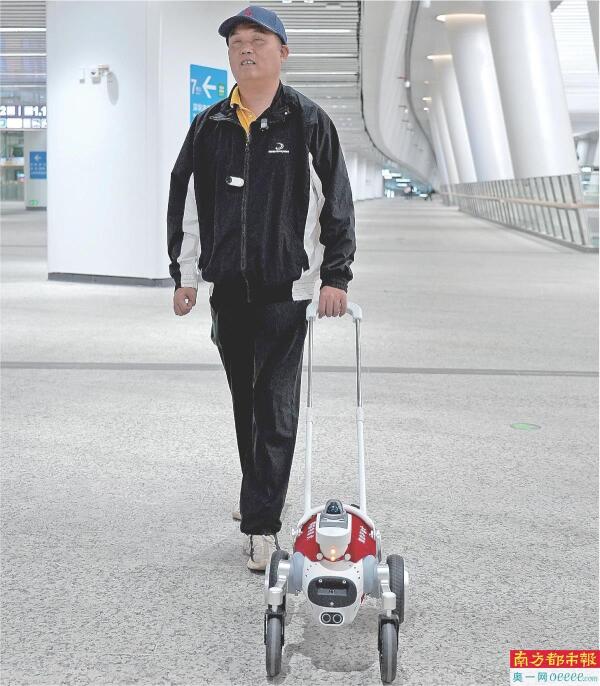 市民么先生正在体验智能导盲犬。 南都记者 赵炎雄 摄