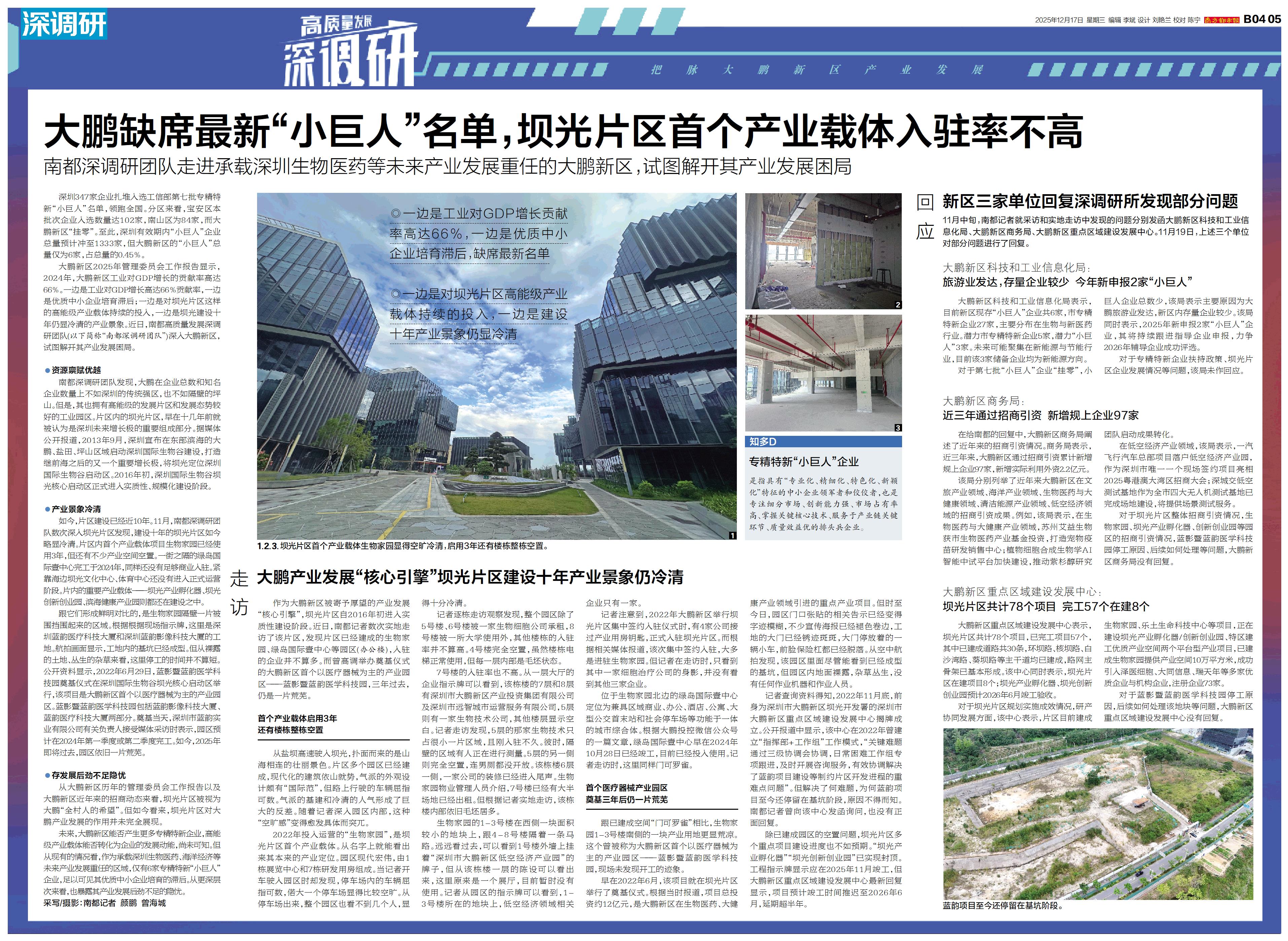大鹏缺席最新“小巨人”名单,坝光片区首个产业载体入驻率不高