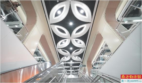 特色站石鼓站毗邻大疆天空之城总部、鹏城实验室、万科云城设计公社等,具有科技创新和艺术创意的文化特征。车站以“无人机”为设计灵感,将机翼、机身的形态,抽象转化为标准化、模块化的装饰单元,构筑出车站空间的主体框架,宛如一架巨型穿梭机,车站立柱犹如科技之树,向上生长,寓意城市的蓬勃发展。