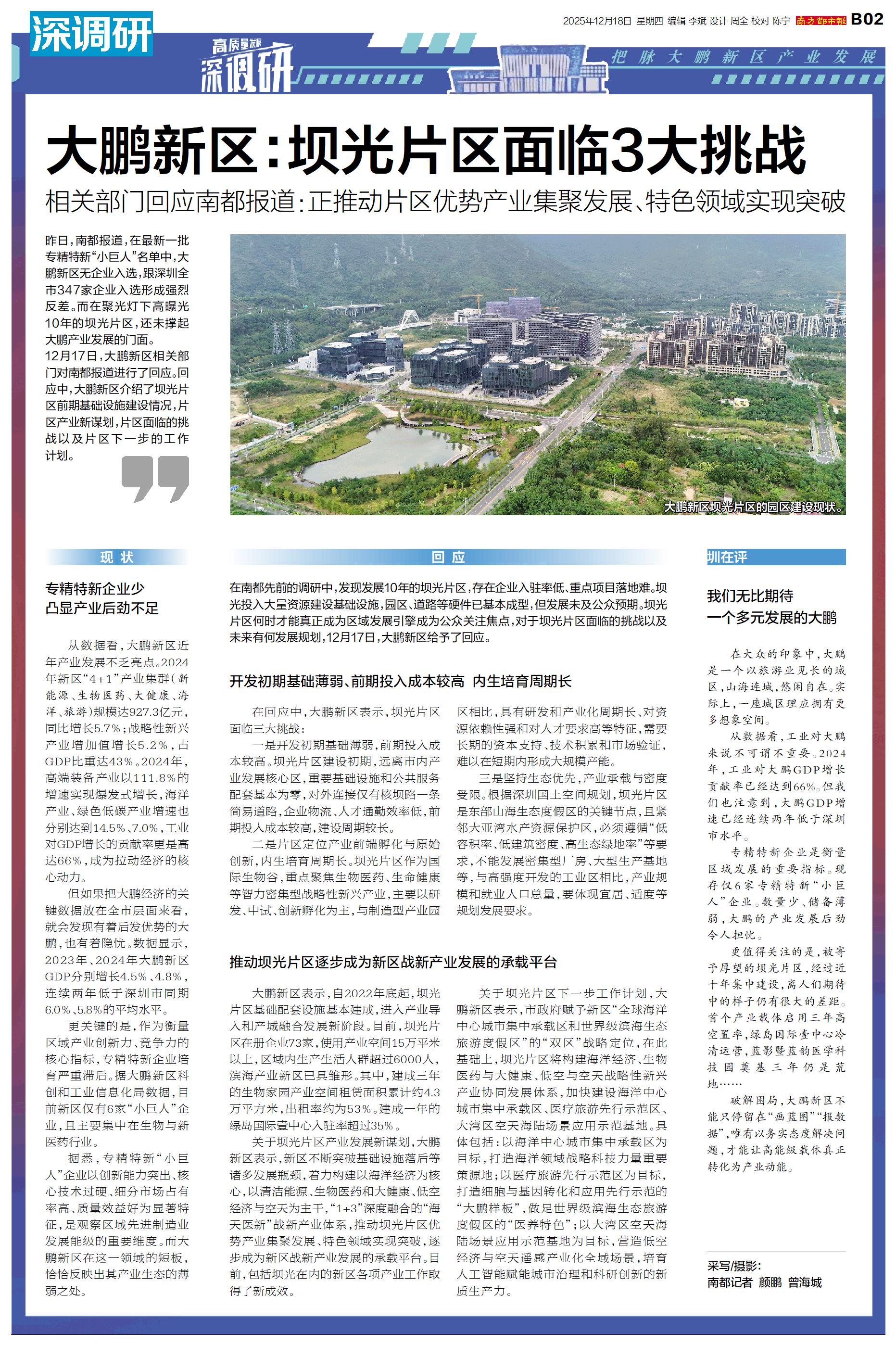 把脉大鹏新区产业发展 昨日,南都报道,在最新一批专精特新“小巨人”名单中,大鹏新区无企业入选,跟深圳全市347家企业入选形成强烈反差。而在聚光灯下高曝光10年的坝光片区,还未撑起大鹏产业发展的门