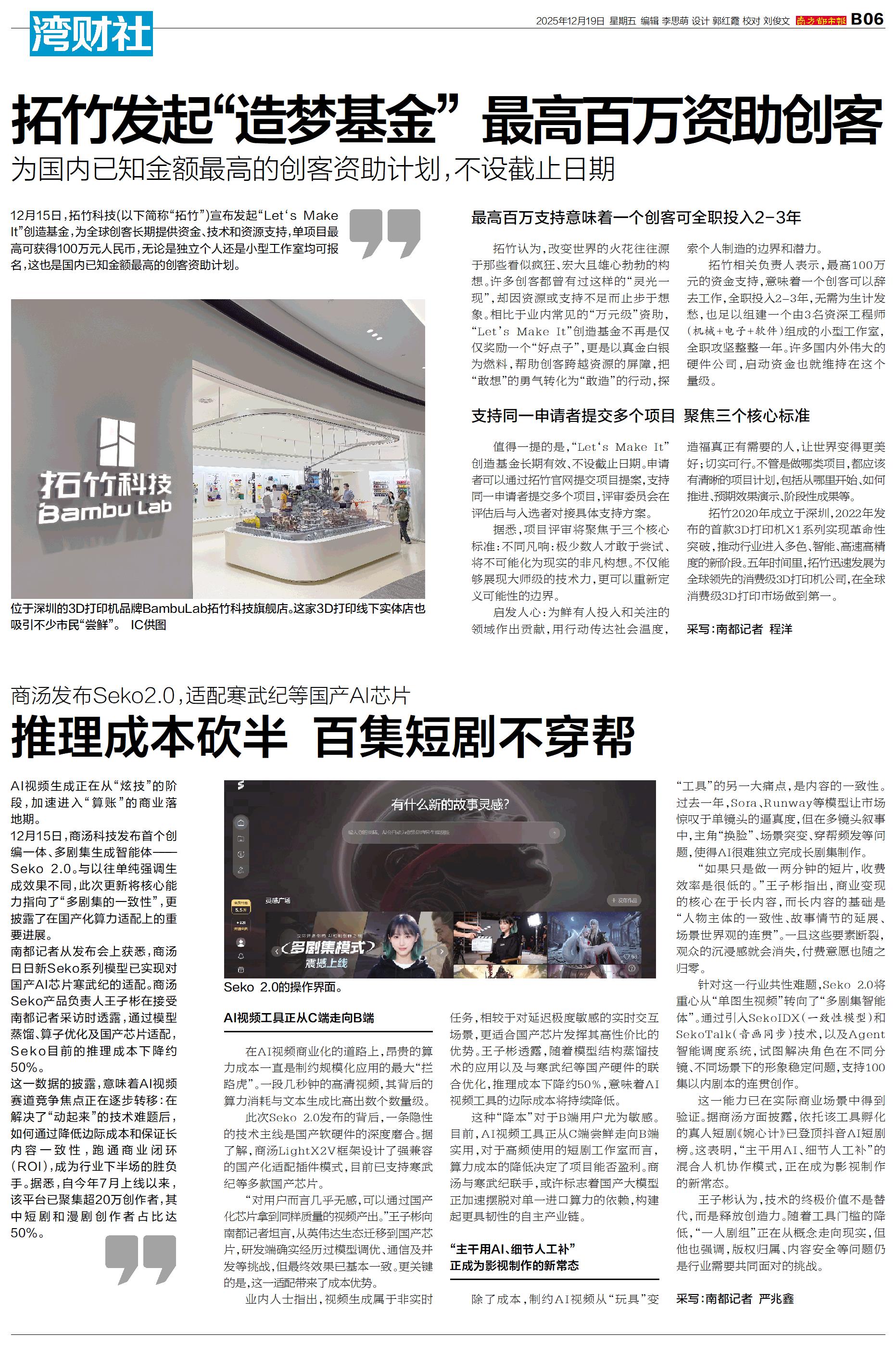 AI视频生成正在从“炫技”的阶段,加速进入“算账”的商业落地期。 12月15日,商汤科技发布首个创编一体、多剧集生成智能体——Seko 2.0。与以往单纯强调生成效果不同,此次更新将核心能力指向