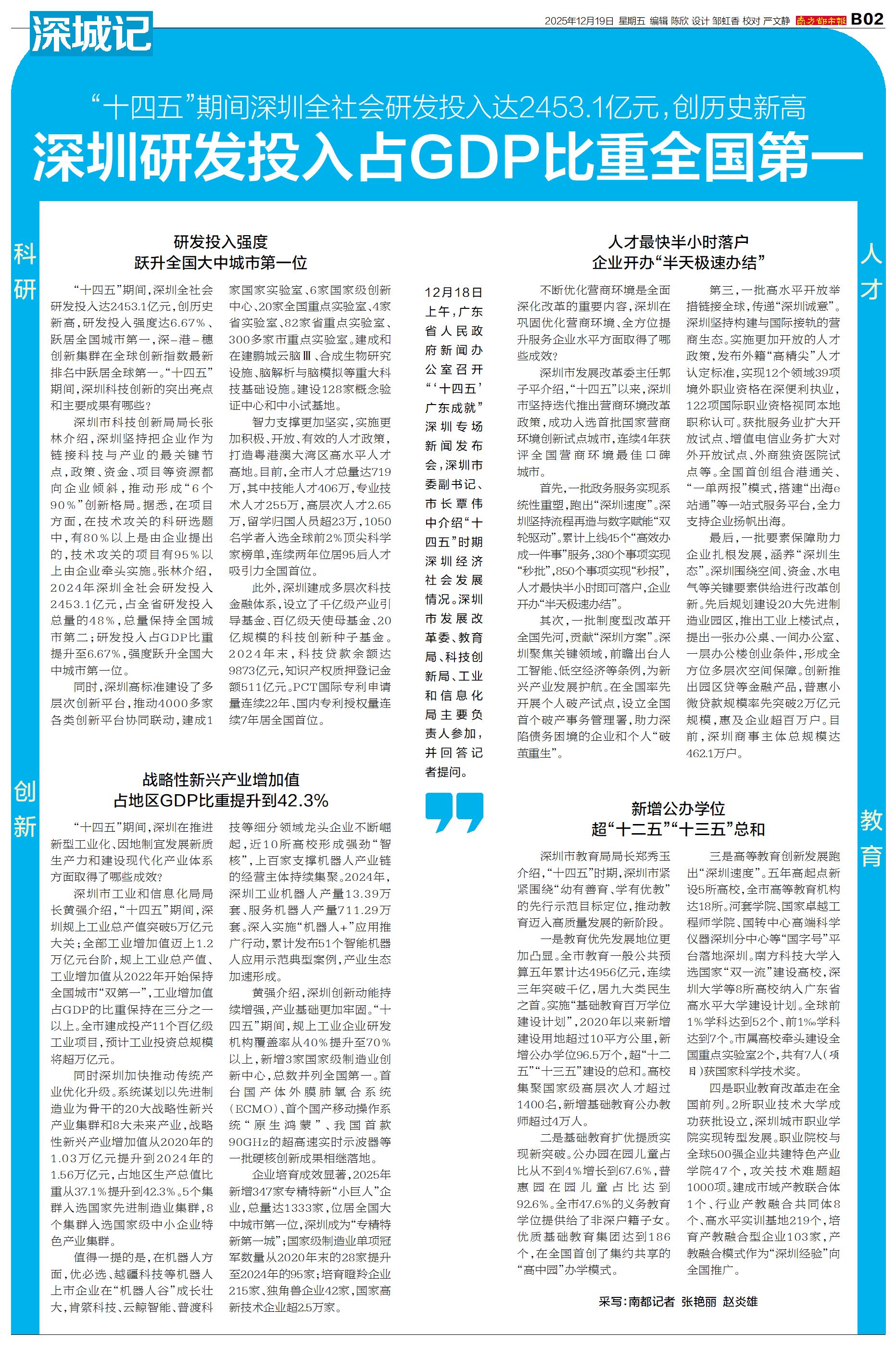 12月18日上午,广东省人民政府新闻办公室召开“‘十四五’广东成就”深圳专场新闻发布会,深圳市委副书记、市长覃伟中介绍“十四五”时期深圳经济社会发展情况。深圳市发展改革委、教育局、科技创新局、工业