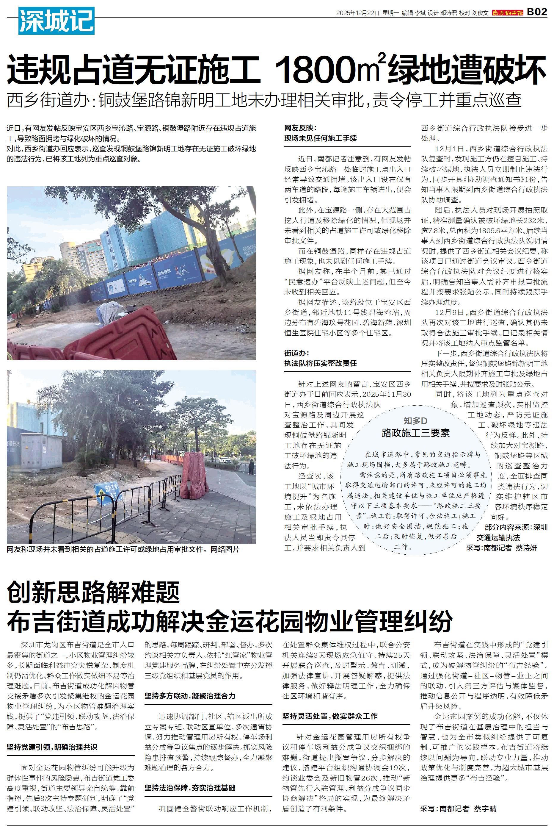 近日,有网友发帖反映宝安区西乡宝沁路、宝源路、铜鼓堡路附近存在违规占道施工,导致路面拥堵与绿化破坏的情况。 对此,西乡街道办回应表示,巡查发现铜鼓堡路锦新明工地存在无证施工破坏绿地的违法行为,已