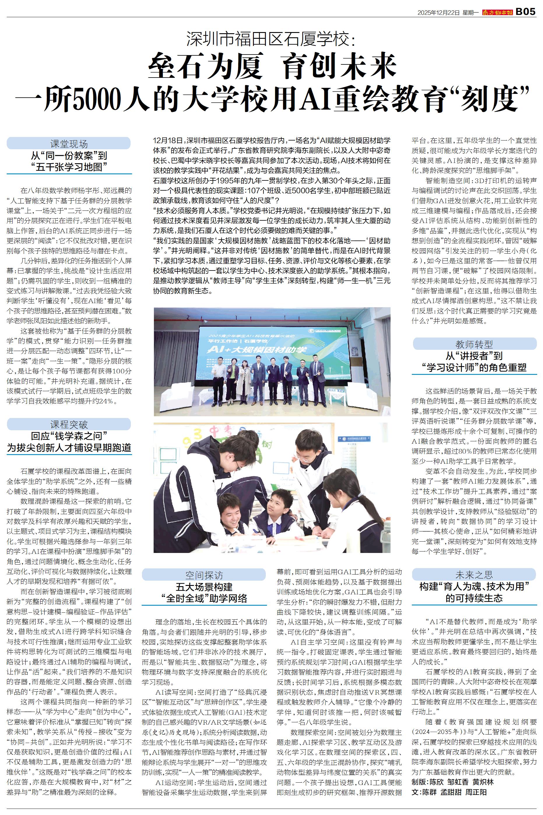 12月18日,深圳市福田区石厦学校报告厅内,一场名为“AI赋能大规模因材助学体系”的发布会正式举行。广东省教育研究院李海东副院长,以及人大附中宓奇校长、巴蜀中学宋晓宇校长等嘉宾共同参加了本次活动。