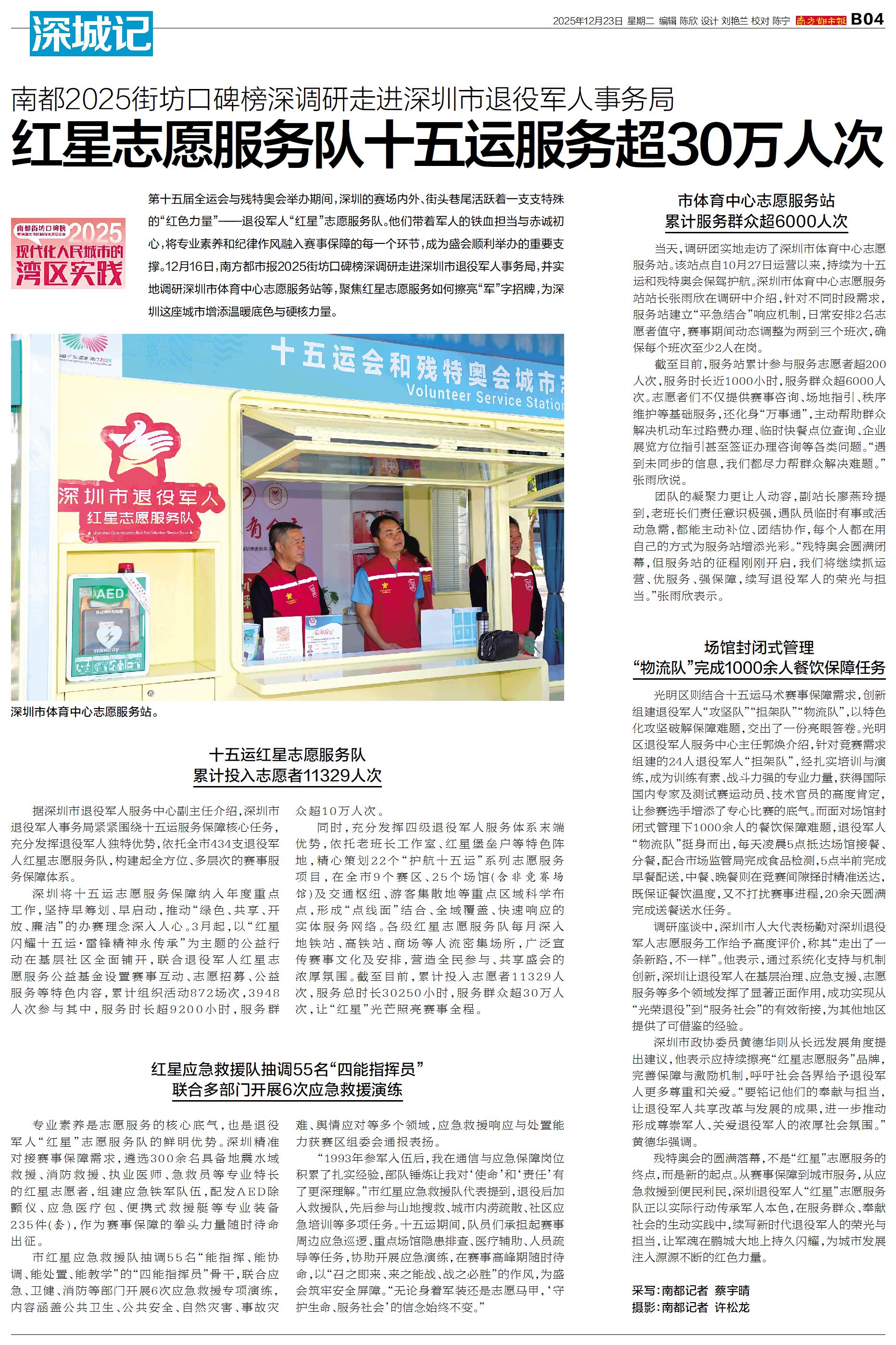 第十五届全运会与残特奥会举办期间,深圳的赛场内外、街头巷尾活跃着一支支特殊的“红色力量”——退役军人“红星”志愿服务队。他们带着军人的铁血担当与赤诚初心,将专业素养和纪律作风融入赛事保障的每一个环