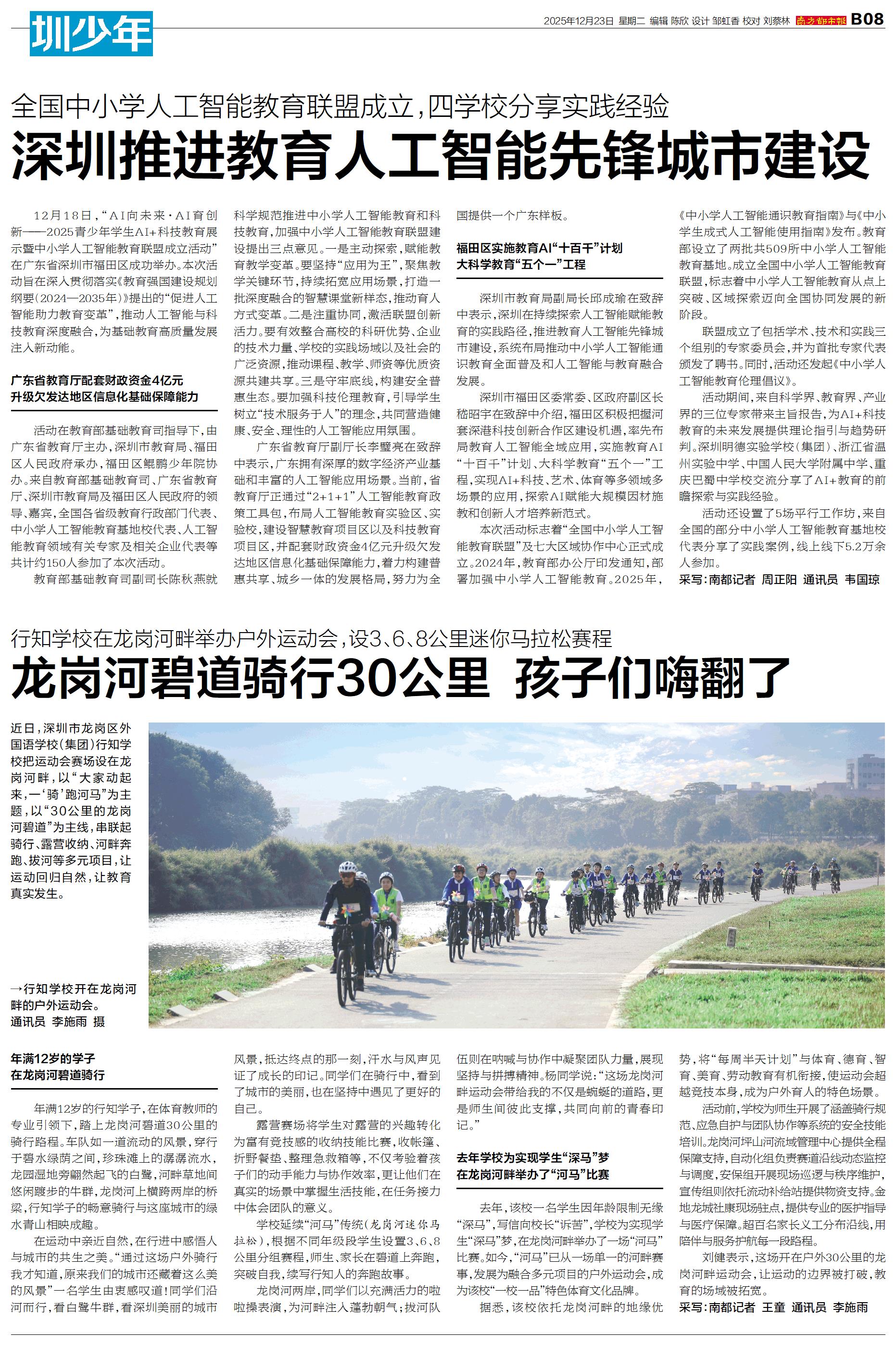 近日,深圳市龙岗区外国语学校(集团)行知学校把运动会赛场设在龙岗河畔,以“大家动起来,一‘骑’跑河马”为主题,以“30公里的龙岗河碧道”为主线,串联起骑行、露营收纳、河畔奔跑、拔河等多元项目,让运