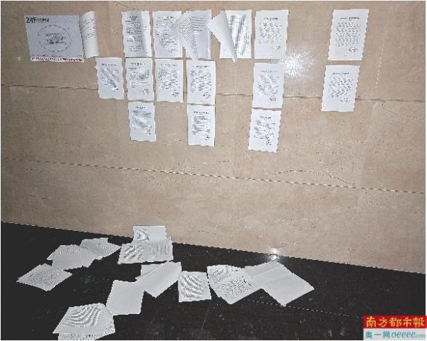 该楼层电梯间的墙面和地面散落着数十份劳动仲裁开庭应诉通知书。