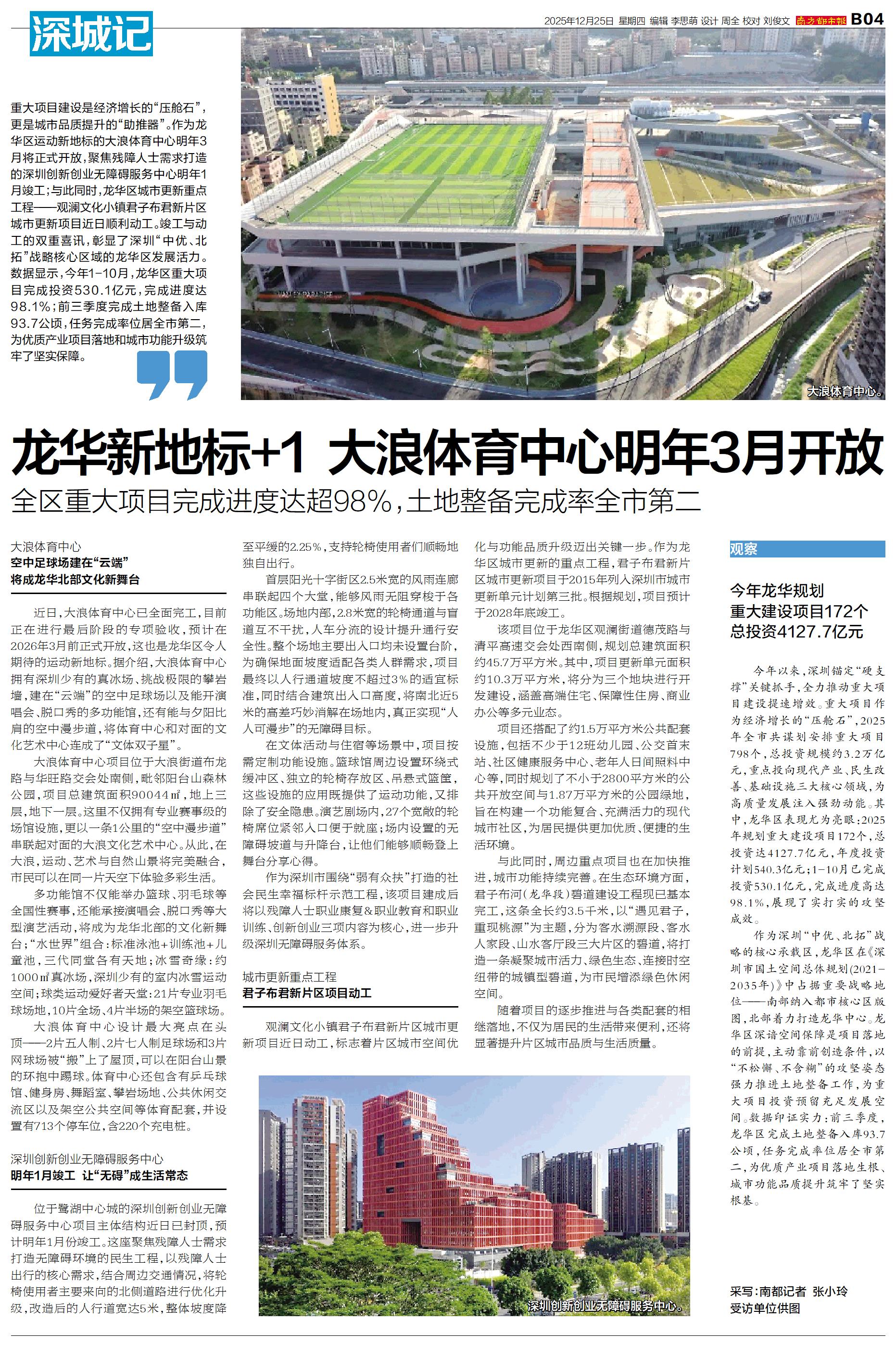 重大项目建设是经济增长的“压舱石”,更是城市品质提升的“助推器”。作为龙华区运动新地标的大浪体育中心明年3月将正式开放,聚焦残障人士需求打造的深圳创新创业无障碍服务中心明年1月竣工;与此同时,龙华