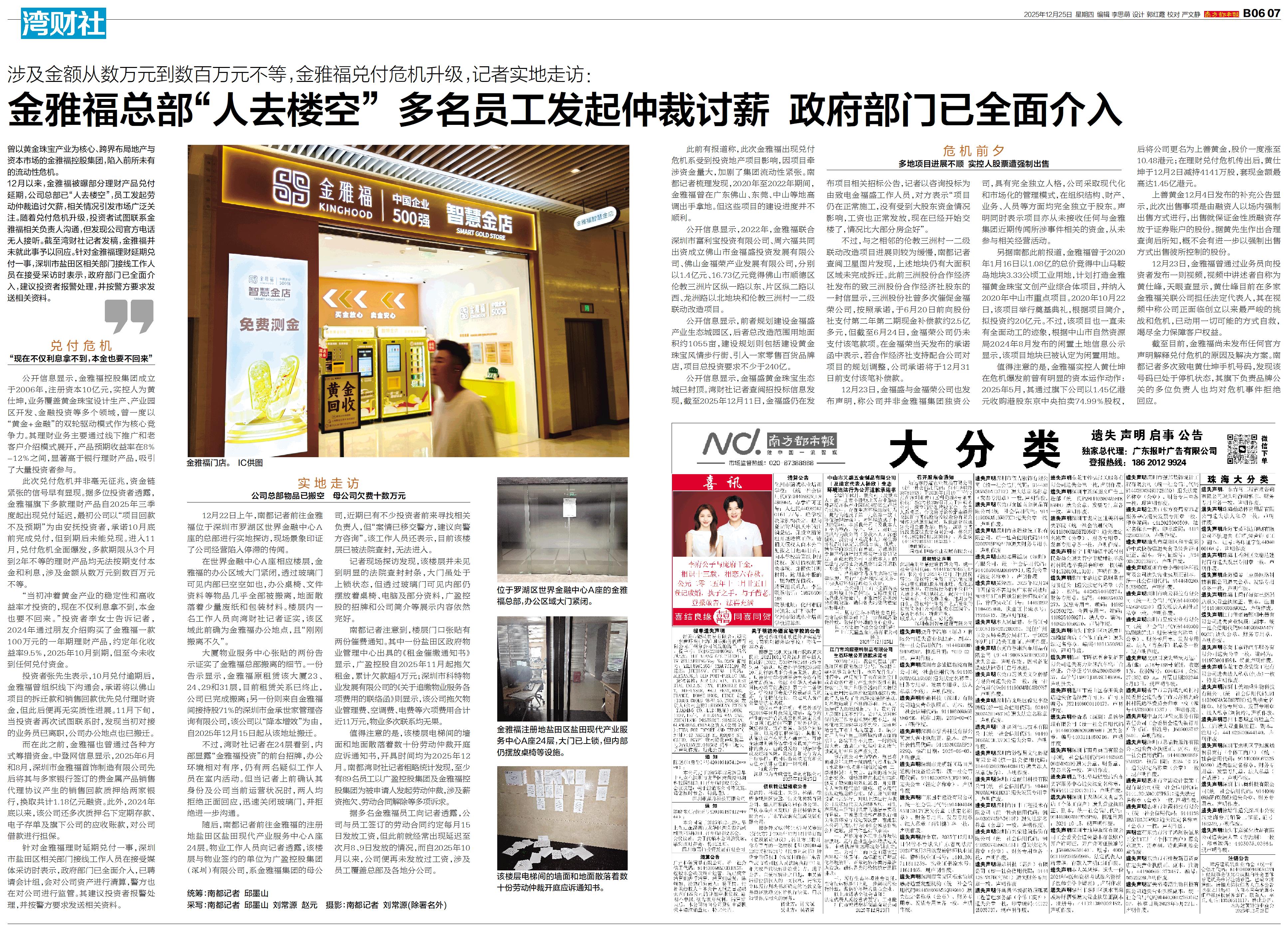 曾以黄金珠宝产业为核心、跨界布局地产与资本市场的金雅福控股集团,陷入前所未有的流动性危机。 12月以来,金雅福被曝部分理财产品兑付延期,公司总部已“人去楼空”,员工发起劳动仲裁追讨欠薪,相关情况
