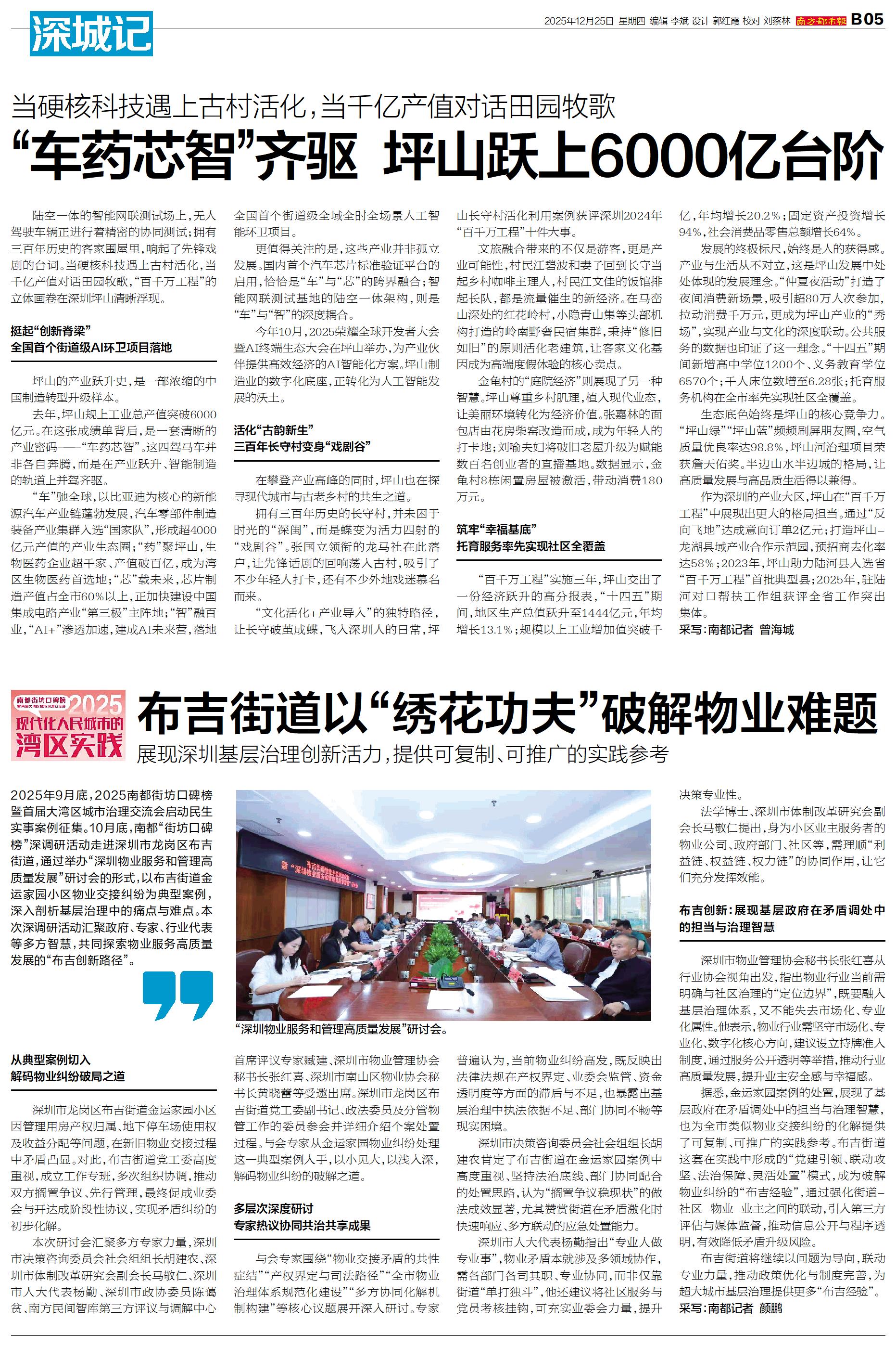 2025年9月底,2025南都街坊口碑榜暨首届大湾区城市治理交流会启动民生实事案例征集。10月底,南都“街坊口碑榜”深调研活动走进深圳市龙岗区布吉街道,通过举办“深圳物业服务和管理高质量发展”研讨