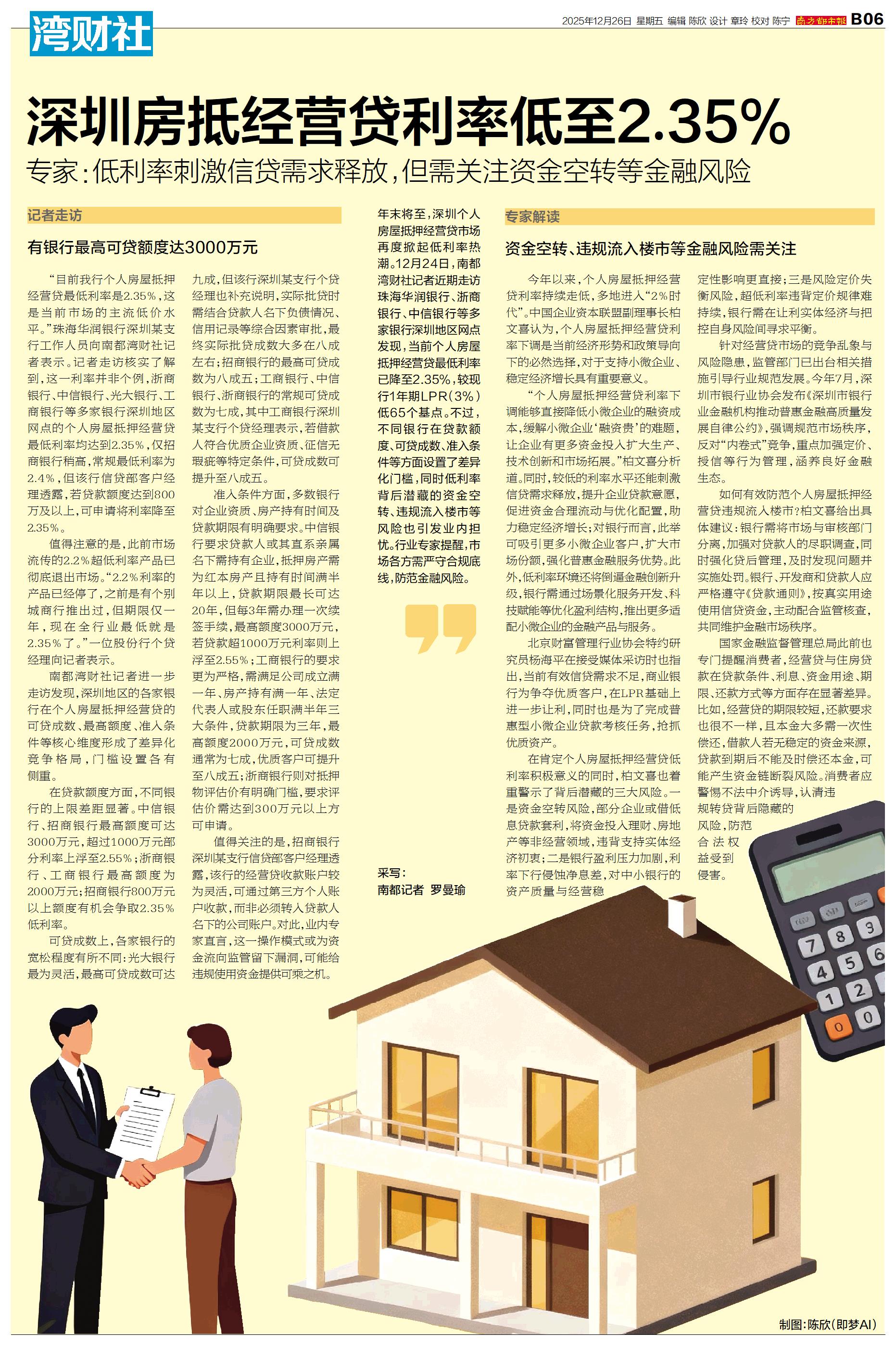 年末将至,深圳个人房屋抵押经营贷市场再度掀起低利率热潮。12月24日,南都湾财社记者近期走访珠海华润银行、浙商银行、中信银行等多家银行深圳地区网点发现,当前个人房屋抵押经营贷最低利率已降至2.35