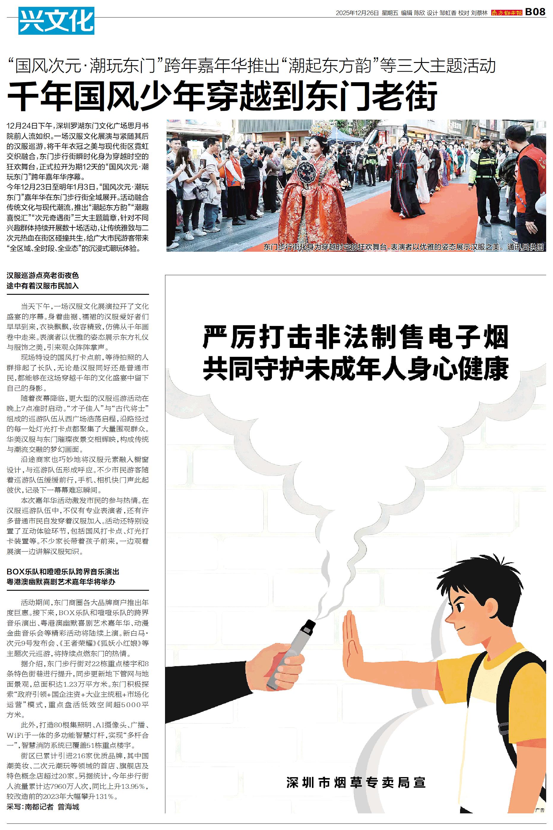 12月24日下午,深圳罗湖东门文化广场思月书院前人流如织。一场汉服文化展演与紧随其后的汉服巡游,将千年衣冠之美与现代街区霓虹交织融合,东门步行街瞬时化身为穿越时空的狂欢舞台,正式拉开为期12天的“