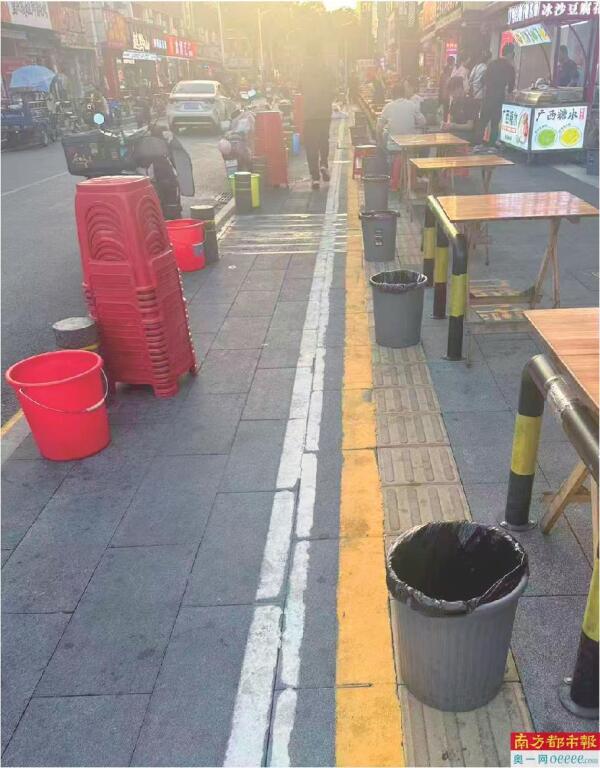 近日,南都记者回访发现,街道在划定的外摆区域边缘加设了整齐的护栏,实现了空间硬隔离。这些护栏有效遏制了桌椅无限外扩占用盲道的情况。每隔一段距离就能看到新增加的垃圾桶,现场可视垃圾大大减少,整体环境显得干净有序。