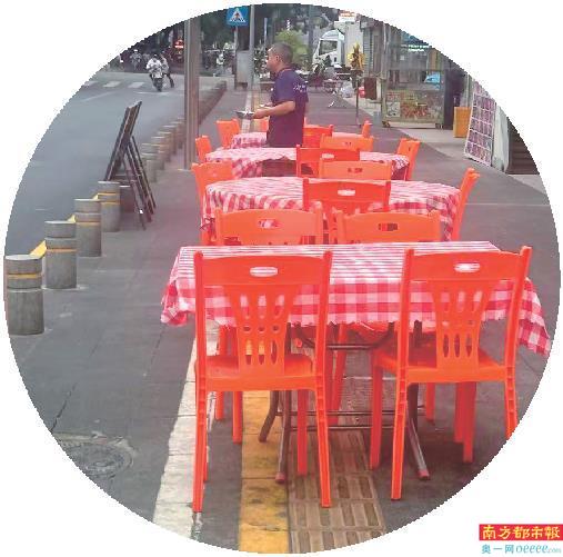 坑梓街道办在划定的外摆区域边缘加设了整齐的护栏,有效遏制了桌椅外扩占道情况。