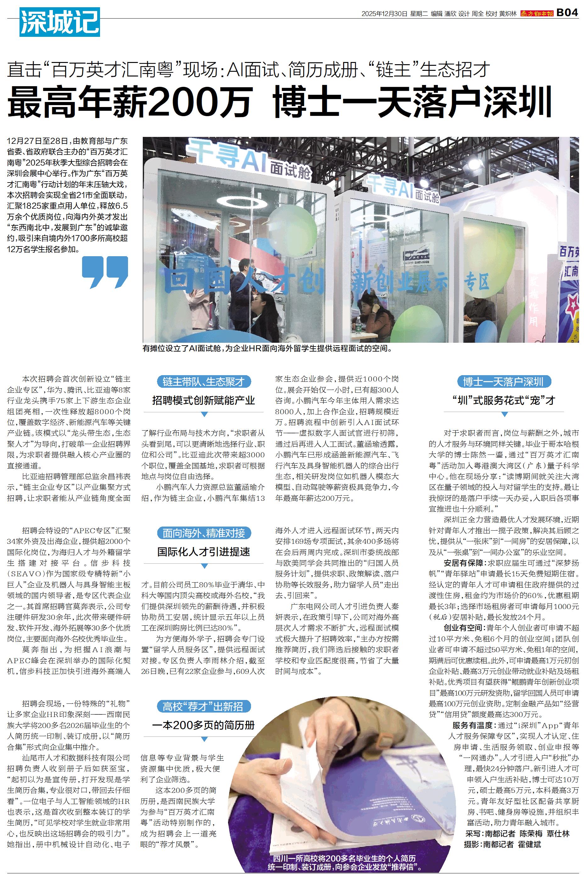 12月27日至28日,由教育部与广东省委、省政府联合主办的“百万英才汇南粤”2025年秋季大型综合招聘会在深圳会展中心举行。作为广东“百万英才汇南粤”行动计划的年末压轴大戏,本次招聘会实现全省21