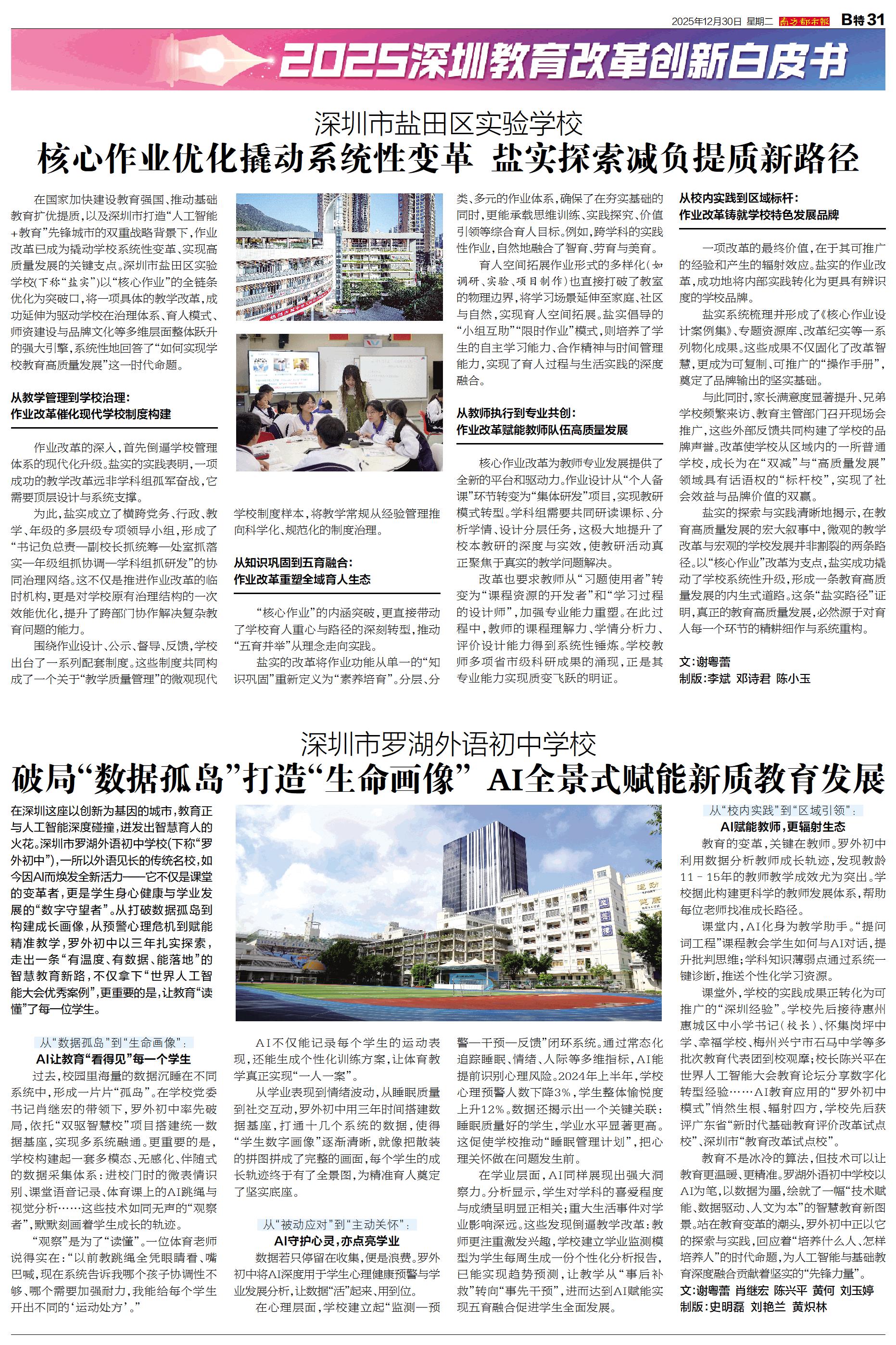 在国家加快建设教育强国、推动基础教育扩优提质,以及深圳市打造“人工智能+教育”先锋城市的双重战略背景下,作业改革已成为撬动学校系统性变革、实现高质量发展的关键支点。深圳市盐田区实验学校(下称“盐实