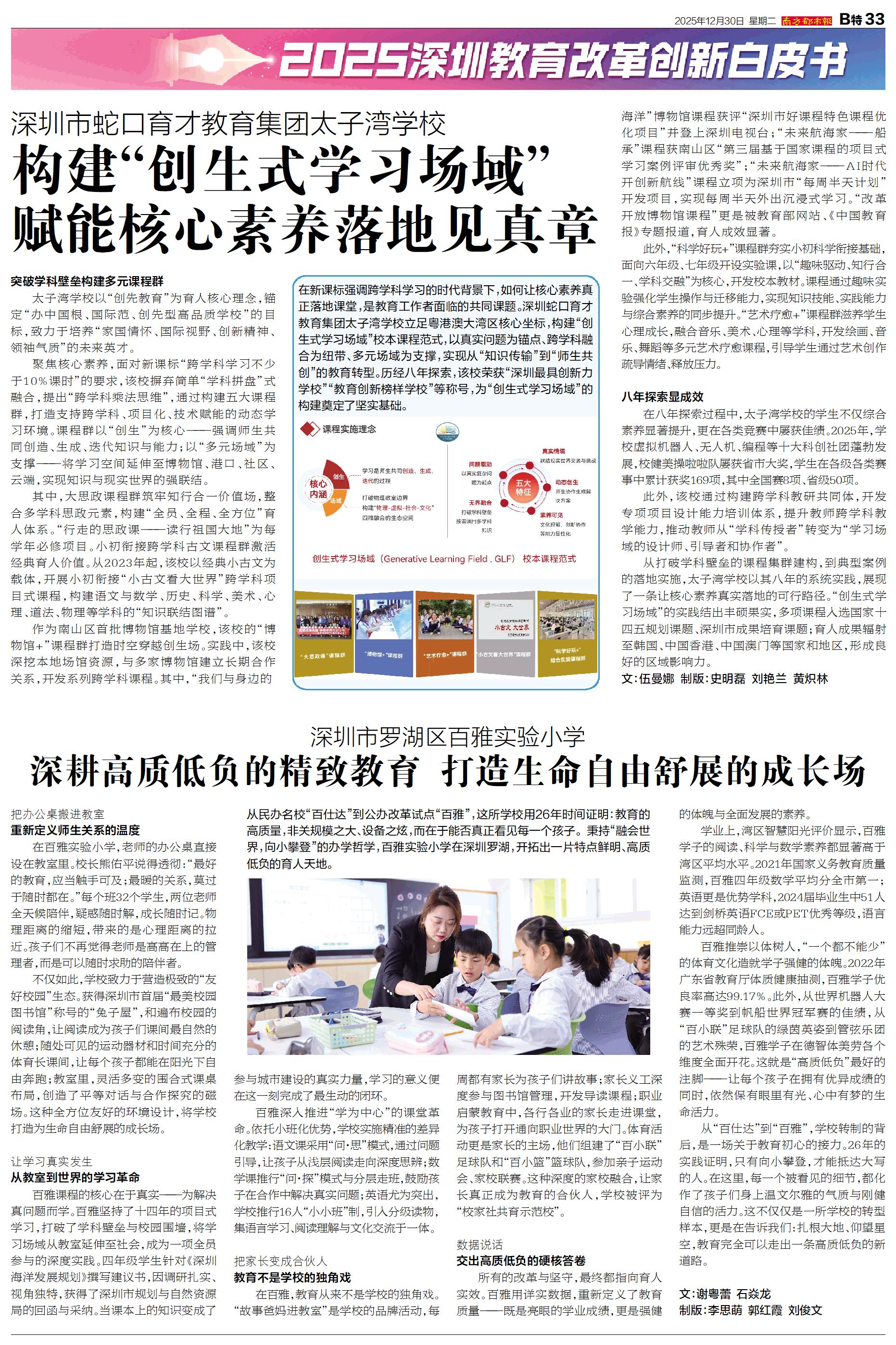 从民办名校“百仕达”到公办改革试点“百雅”,这所学校用26年时间证明:教育的高质量,非关规模之大、设备之炫,而在于能否真正看见每一个孩子。秉持“融会世界,向小攀登”的办学哲学,百雅实验小学在深圳罗